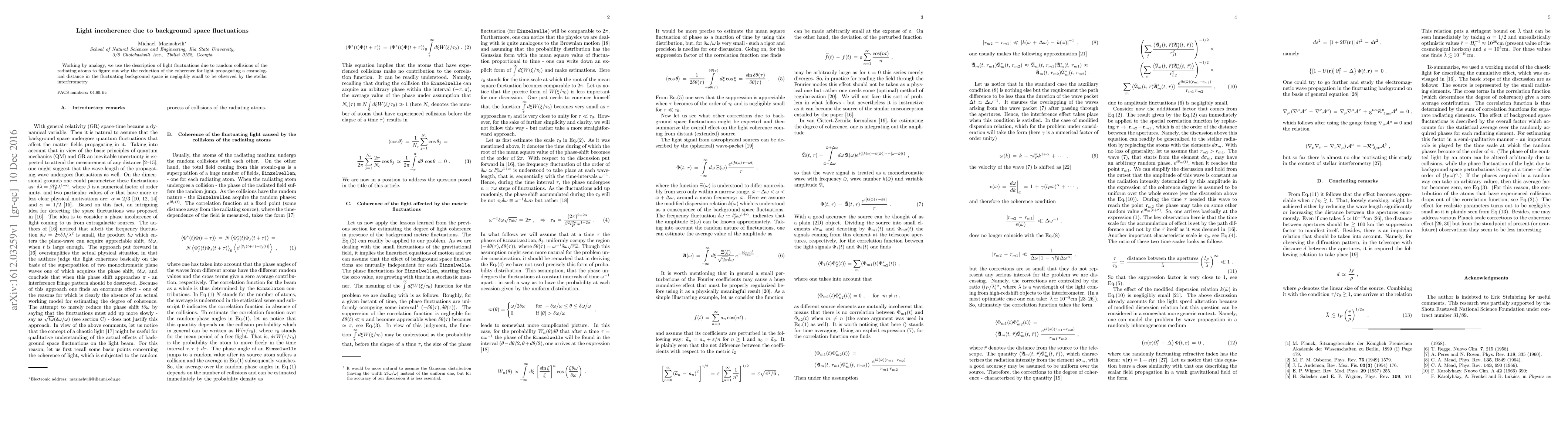 Working by analogy, we use the description of light fluctuations due to random collisions of the radiating atoms to figure out why the reduction of the coherence for light propagating a cosmological distance in the fluctuating background space is negligibly small to be observed by the stellar interferometry.