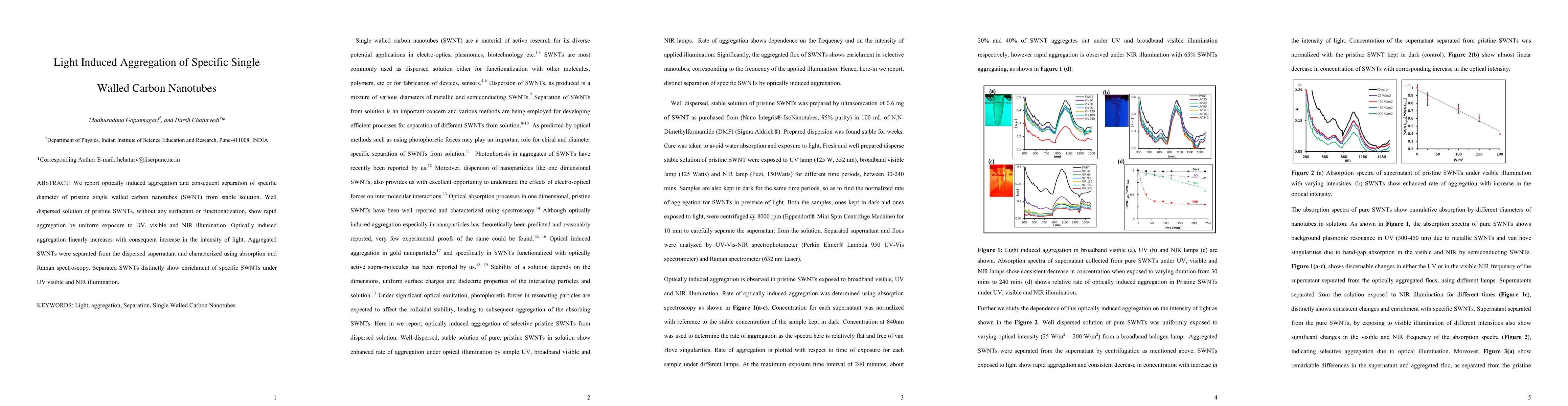 This study demonstrates the use of light to induce the aggregation and separation of specific diameter single-walled carbon nanotubes (SWNT) from a stable solution. Under UV, visible, and NIR illumination, pristine SWNTs aggregate in a manner that increases with light intensity, allowing for their enrichment and separation via absorption and Raman spectroscopy.