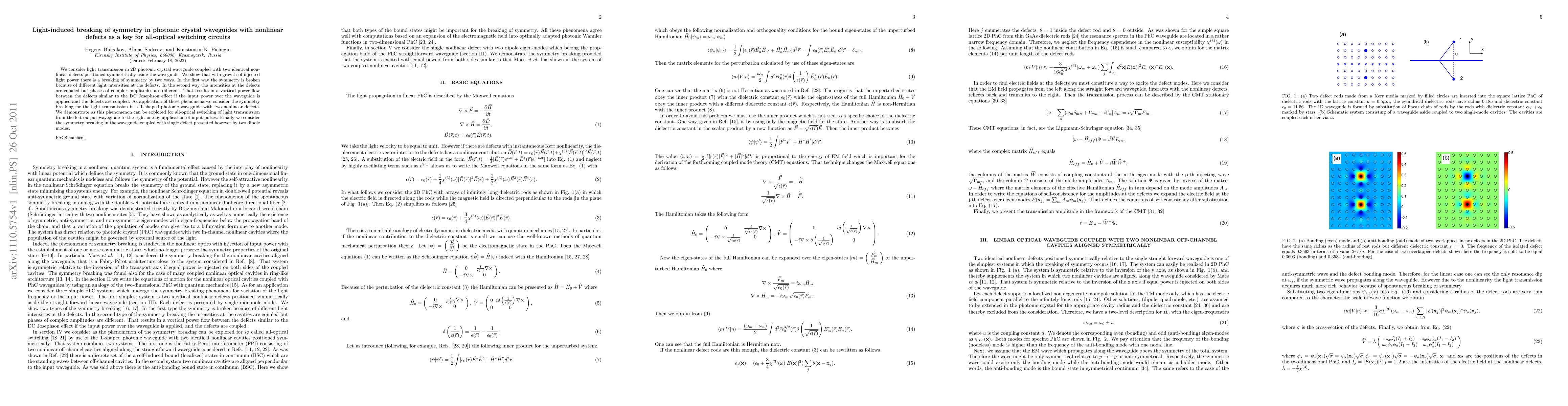 This paper investigates light transmission in photonic crystal waveguides with nonlinear defects, demonstrating light-induced symmetry breaking that enables all-optical switching. The study shows that increased light power can lead to either intensity or phase differences between defects, resulting in vortical power flow and potential for switching light transmission in T-shaped waveguides.