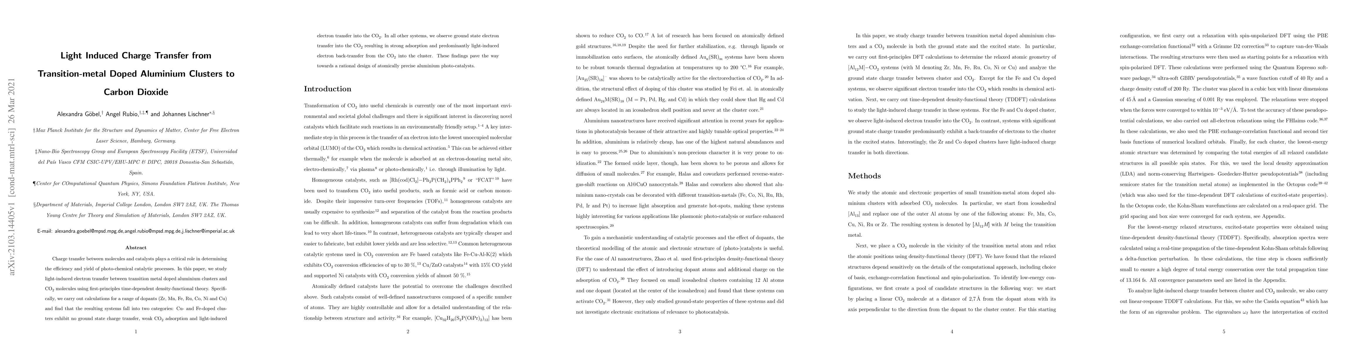 Charge transfer between molecules and catalysts plays a critical role in determining the efficiency and yield of photo-chemical catalytic processes. In this paper, we study light-induced electron transfer between transition metal doped aluminium clusters and CO$_2$ molecules using first-principles time-dependent density-functional theory. Specifically, we carry out calculations for a range of dopants (Zr, Mn, Fe, Ru, Co, Ni and Cu) and find that the resulting systems fall into two categories: Cu- and Fe-doped clusters exhibit no ground state charge transfer, weak CO$_2$ adsorption and light-induced electron transfer into the CO$_2$. In all other systems, we observe ground state electron transfer into the CO$_2$ resulting in strong adsorption and predominantly light-induced electron back-transfer from the CO$_2$ into the cluster. These findings pave the way towards a rational design of atomically precise aluminium photo-catalysts.