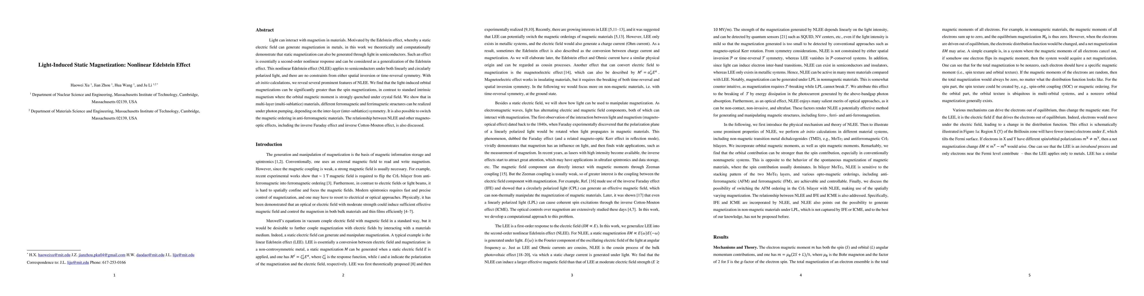 We theoretically and computationally demonstrate that static magnetization can be generated under light illumination via nonlinear Edelstein effect (NLEE). NLEE is applicable to semiconductors under both linearly and circularly polarized light, and there are no constraints from either spatial inversion or time-reversal symmetry. Remarkably, magnetization can be induced under linearly polarized light in nonmagnetic materials. With ab initio calculations, we reveal several prominent features of NLEE. We find that the orbital contributions can be significantly greater than the spin contributions. And magnetization with various orderings, including anti-ferromagnetic, ferromagnetic, etc., are all realizable with NLEE, which may facilitate many applications, such as unveiling hidden physical effects, creating a spatially varying magnetization, or manipulating the magnetization of anti-ferromagnetic materials. The relationship between NLEE and other magneto-optic effects, including the inverse Faraday effect and inverse Cotton-Mouton effect, is also discussed.