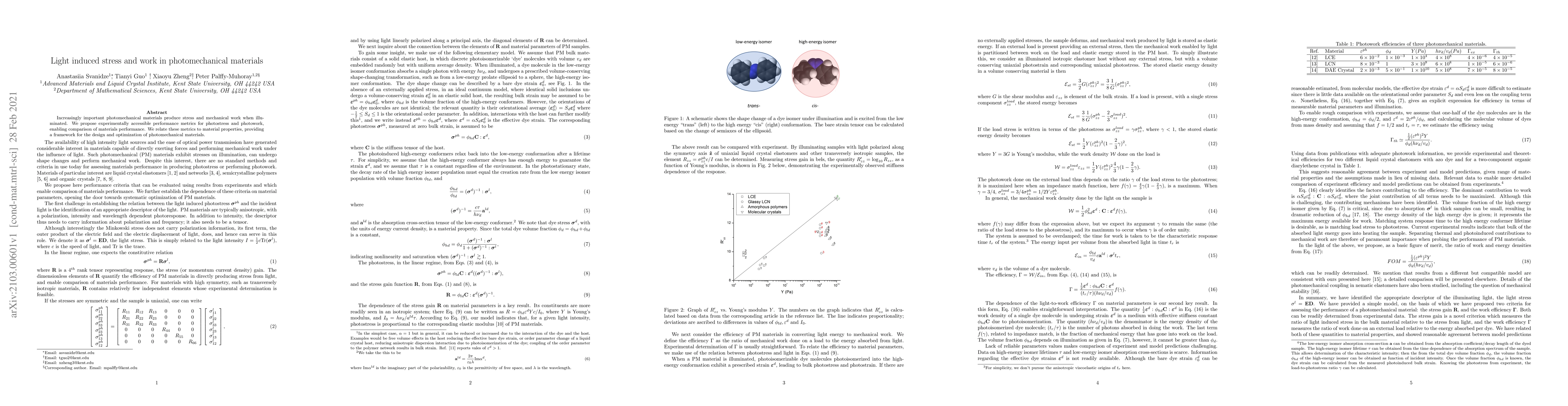 This paper proposes performance metrics for evaluating stress and mechanical work in photomechanical materials when exposed to light, offering a framework to guide the design and optimization of these materials based on their properties.