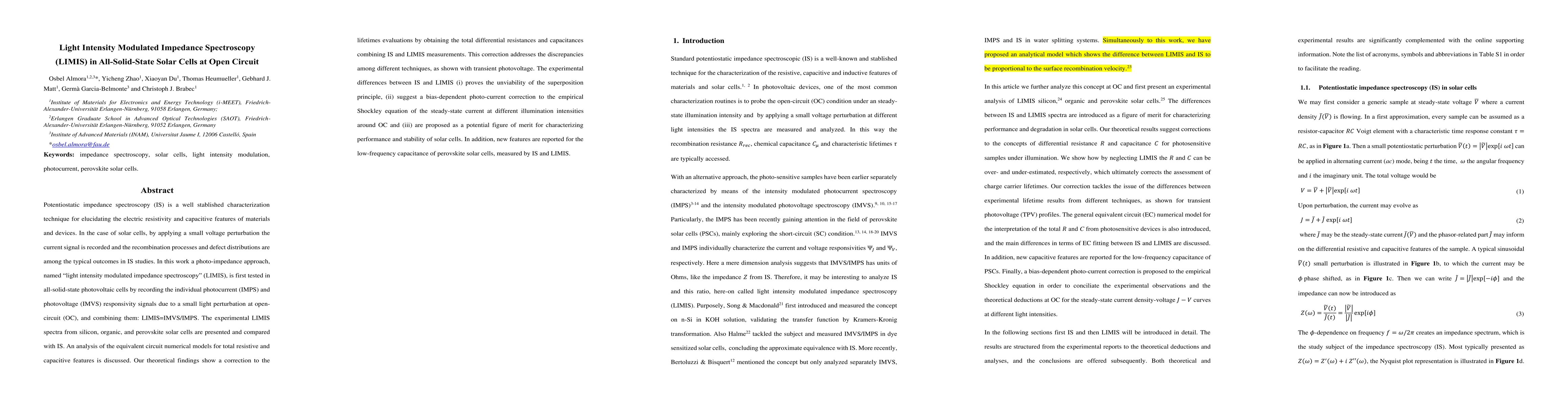 This paper introduces light intensity modulated impedance spectroscopy (LIMIS) to characterize the resistive and capacitive features of all-solid-state solar cells, demonstrating its potential to correct lifetime evaluations and provide a new figure of merit for solar cell performance and stability. LIMIS reveals discrepancies with traditional impedance spectroscopy, suggesting bias-dependent photo-current corrections and new insights into low-frequency capacitance in perovskite solar cells.