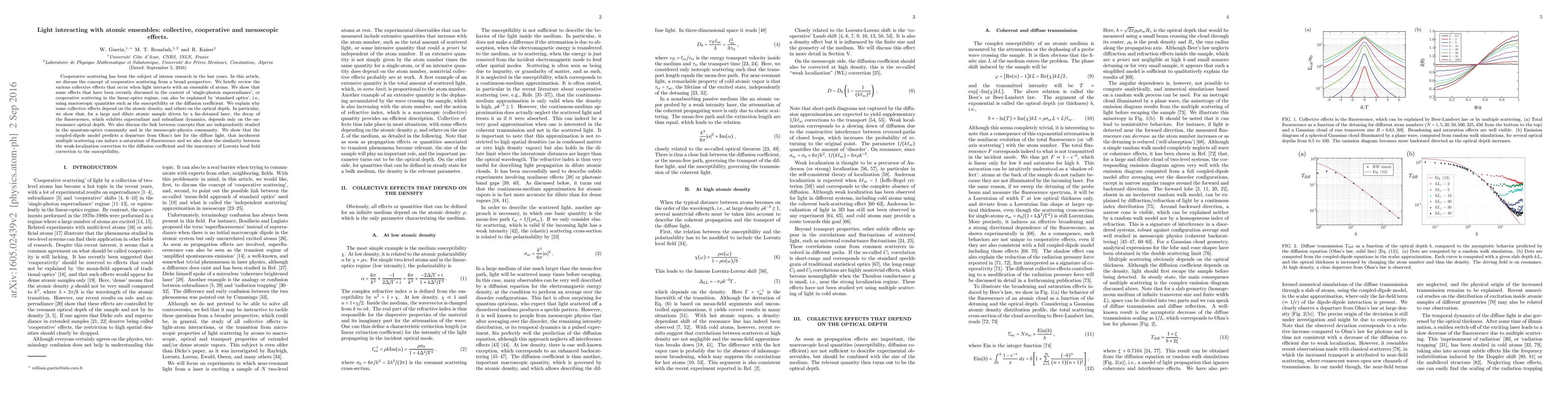 This paper reviews cooperative scattering and collective effects in atomic ensembles, demonstrating that phenomena like 'single-photon superradiance' can be explained by standard optics. It also discusses the dependence of these effects on atomic density and optical depth, and links concepts from quantum optics and mesoscopic physics.