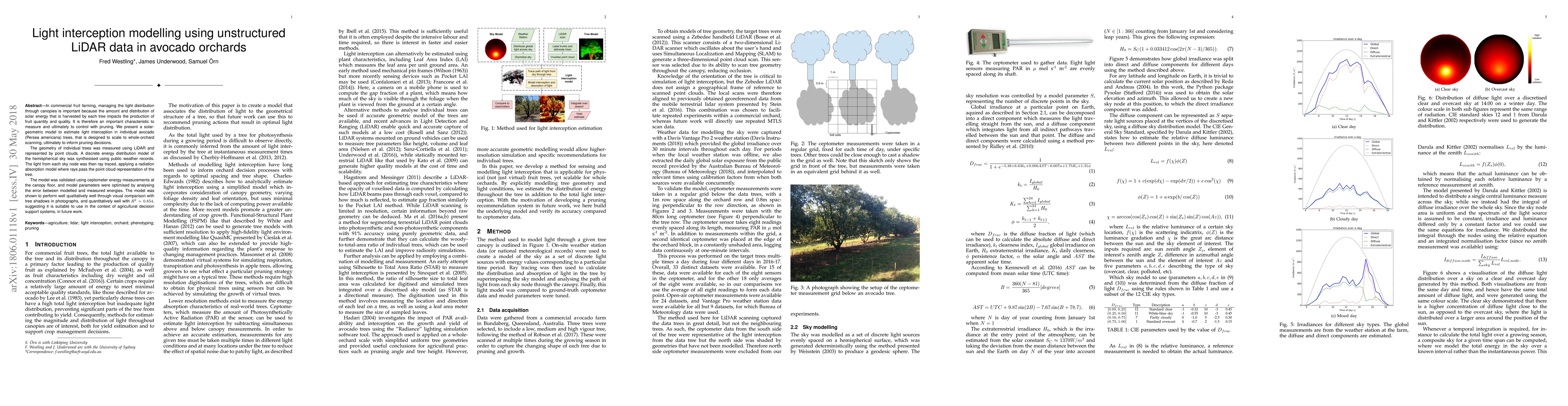 A new model estimates light interception in avocado trees using LiDAR data and hemispherical sky distributions, validating its performance with canopy floor energy measurements.