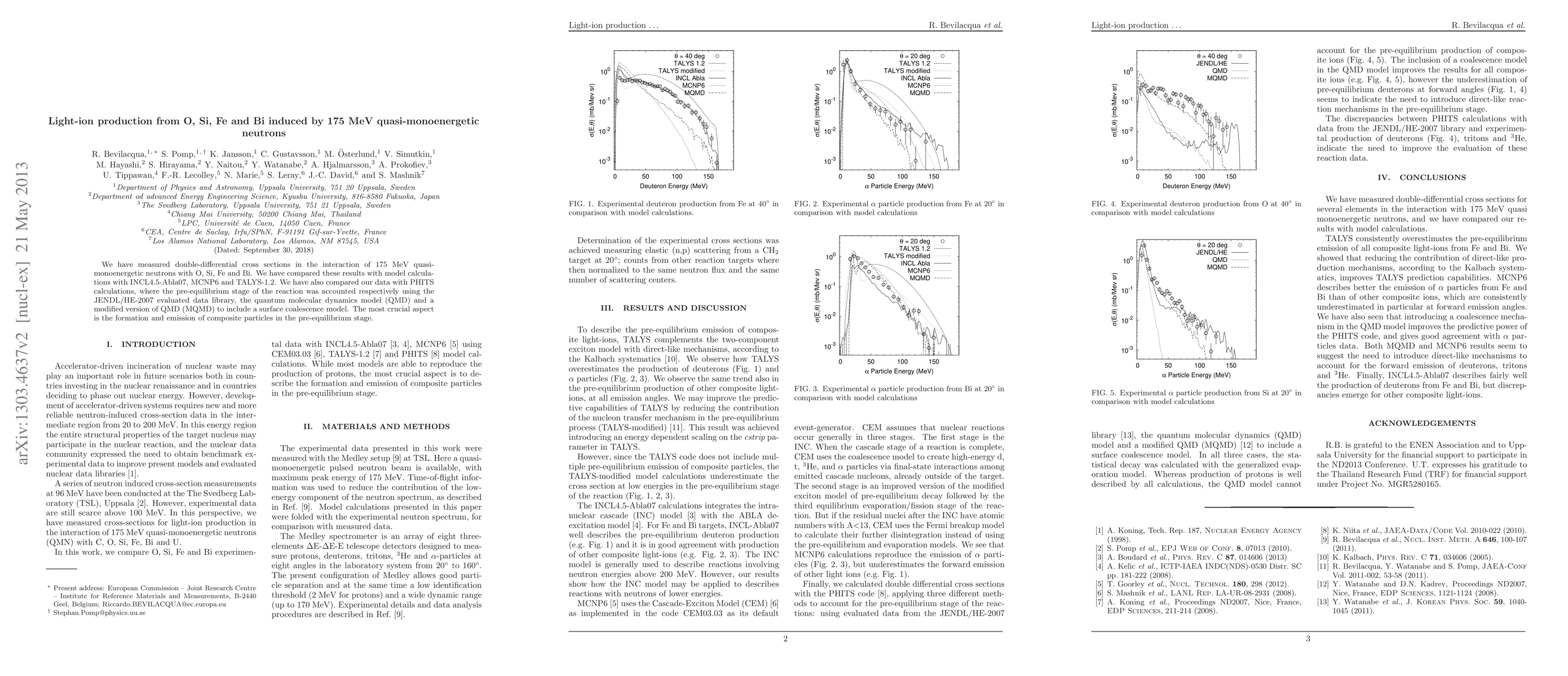 We have measured double-differential cross sections in the interaction of 175 MeV quasimonoenergetic neutrons with O, Si, Fe and Bi. We have compared these results with model calculations with INCL4.5-Abla07, MCNP6 and TALYS-1.2. We have also compared our data with PHITS calculations, where the pre-equilibrium stage of the reaction was accounted respectively using the JENDL/HE-2007 evaluated data library, the quantum molecular dynamics model (QMD) and a modified version of QMD (MQMD) to include a surface coalescence model. The most crucial aspect is the formation and emission of composite particles in the pre-equilibrium stage.