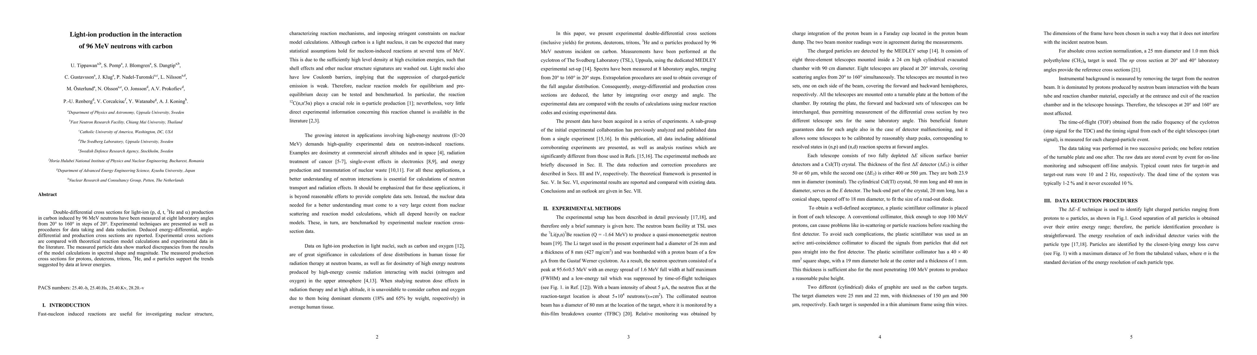 The paper presents measured double-differential cross sections for light-ion production in carbon by 96 MeV neutrons, contrasting experimental results with theoretical model calculations and lower-energy data. Discrepancies in spectral shape and magnitude are observed.