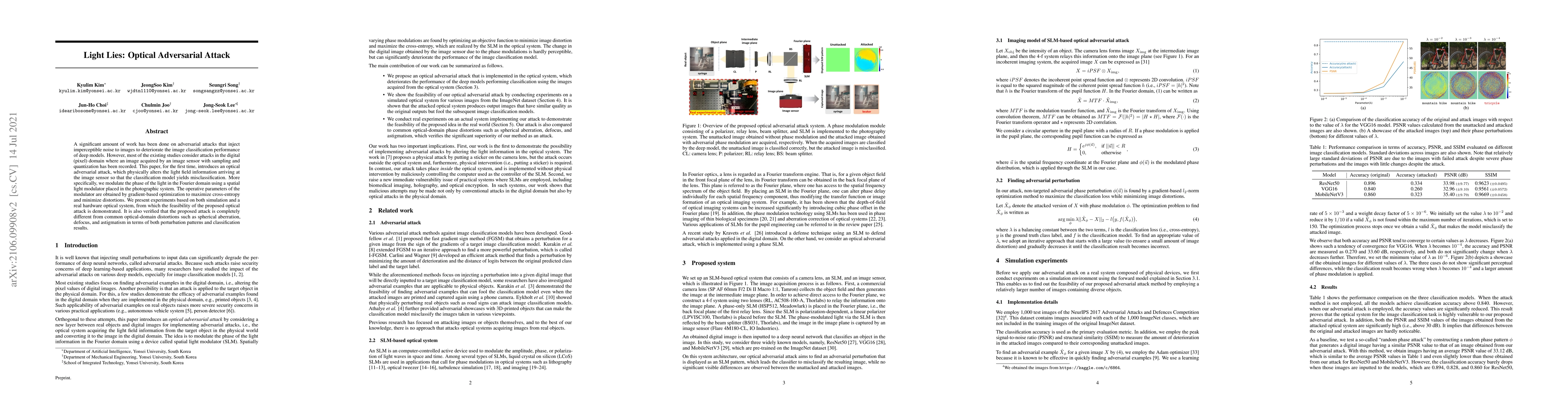 This paper introduces an optical adversarial attack that physically alters the light field to deceive image classification models, using a spatial light modulator to modulate the phase in the Fourier domain. Experiments show the attack's effectiveness and distinguish it from common optical distortions.