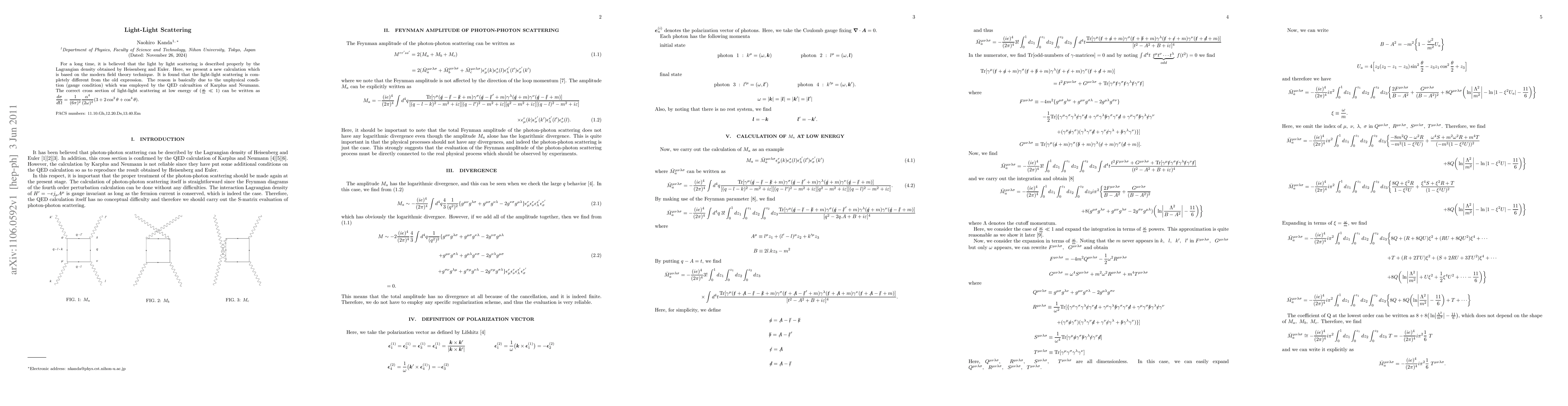 Researchers present a new calculation for light-light scattering using modern field theory techniques, finding it differs from previous expressions due to an unphysical condition. They derive a corrected cross-section formula at low energy, which includes terms not present in previous calculations.