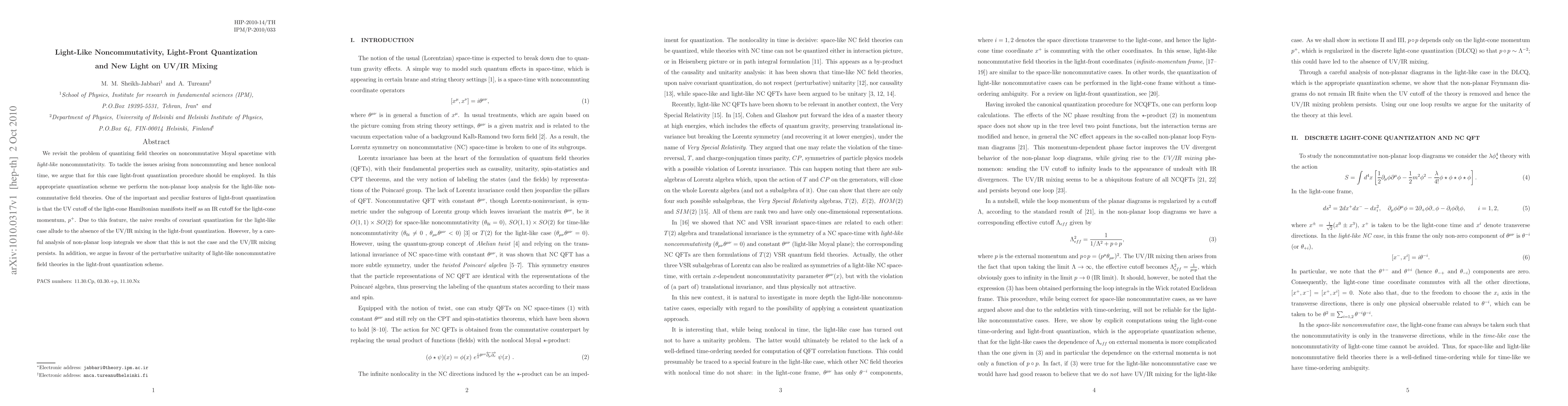This paper explores the quantization of field theories on light-like noncommutative Moyal spacetime using light-front quantization, revealing that despite initial indications, UV/IR mixing still occurs in non-planar loop integrals. It also supports the perturbative unitarity of these theories within this framework.
