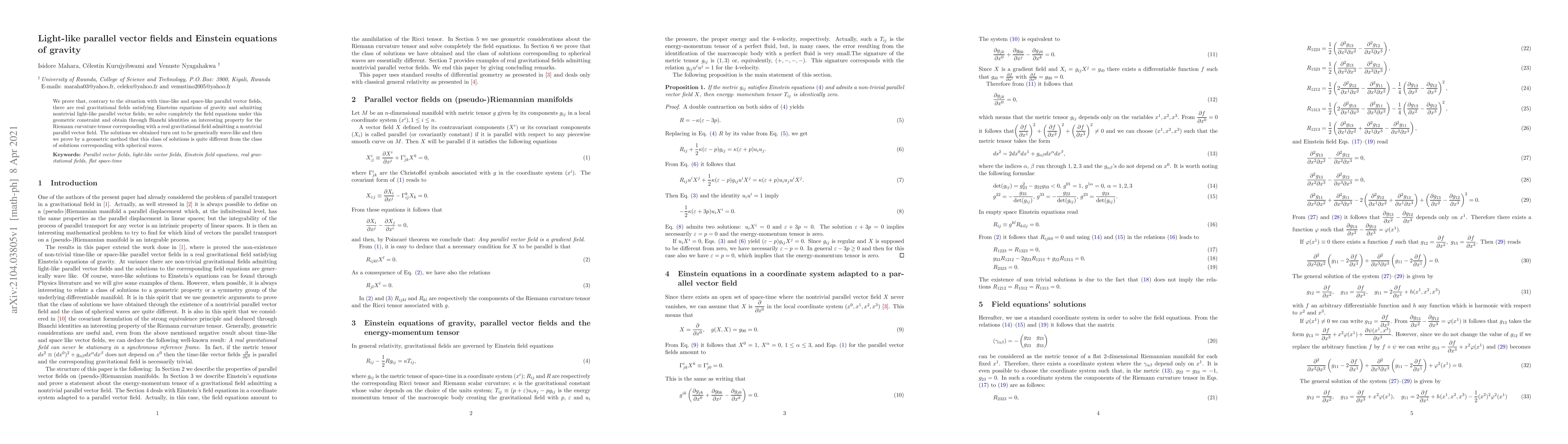 We prove that, contrary to the situation with time-like and space-like parallel vector fields, there are real gravitational fields satisfying Einsteins equations of gravity and admitting nontrivial light-like parallel vector fields; we solve completely the field equations under this geometric constraint and obtain through Bianchi identities an interesting property for the Riemann curvature tensor corresponding with a real gravitational field admitting a nontrivial parallel vector field. The solutions we obtained turn out to be generically wave-like and then we prove by a geometric method that this class of solutions is quite different from the class of solutions corresponding with spherical waves.