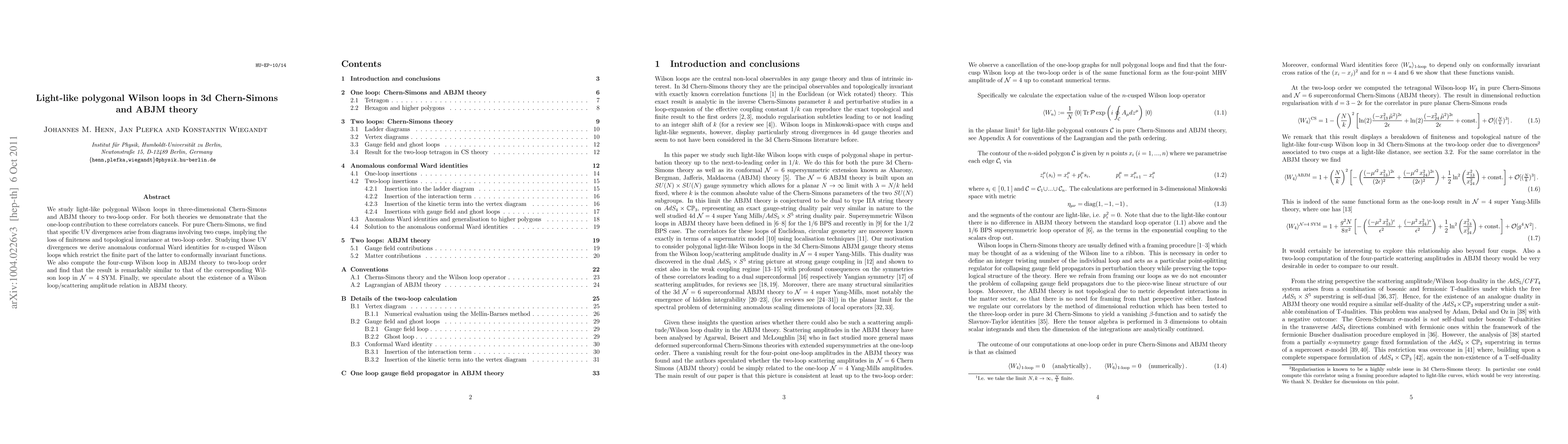 This paper investigates light-like polygonal Wilson loops in 3D Chern-Simons and ABJM theories up to two-loop order, finding that one-loop contributions cancel out. It reveals UV divergences in Chern-Simons theory from two-cusp diagrams, leading to anomalous conformal Ward identities for n-cusped loops. The study also computes the two-loop four-cusp Wilson loop in ABJM theory, finding similarities to N=4 SYM, and speculates on a Wilson loop/scattering amplitude connection in ABJM theory.