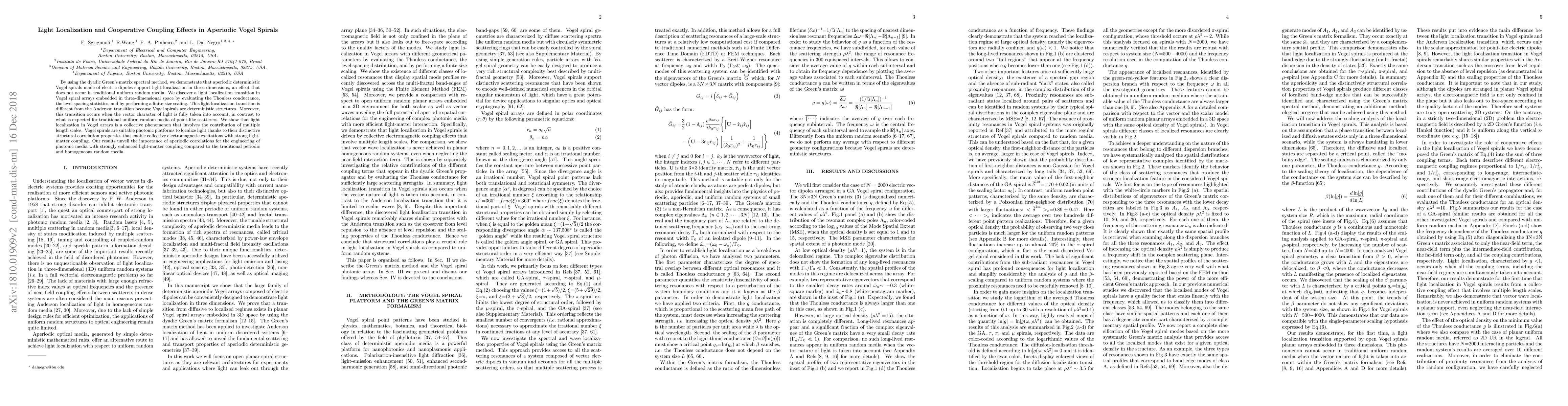 This research demonstrates that aperiodic Vogel spirals, composed of electric dipoles, support three-dimensional light localization distinct from traditional random media. The study reveals a unique light localization transition in these spirals, emphasizing their potential for enhanced light-matter coupling and applications in photonics.