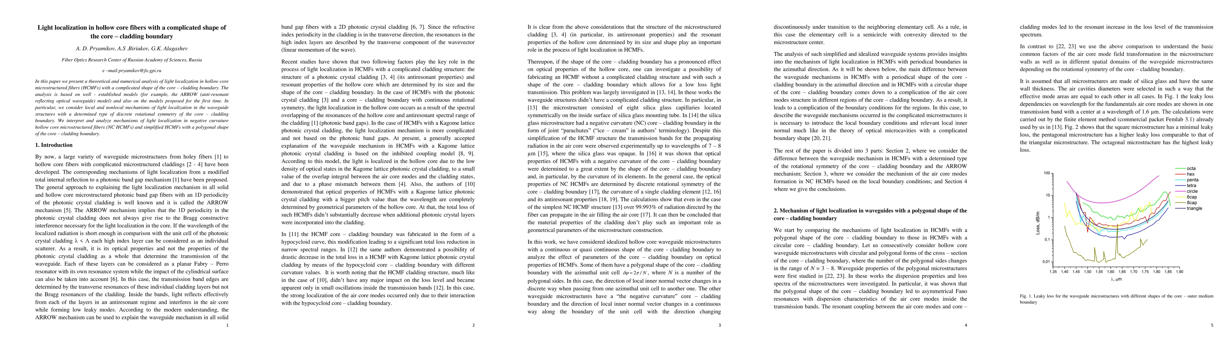 In this paper we present a theoretical and numerical analysis of light localization in hollow core microstructured fibers (HCMFs) with a complicated shape of the core cladding boundary. The analysis is based on well established models (for example, the ARROW model) and also on the models proposed for the first time. In particular, we consider local and nonlocal mechanisms of light localization in the waveguide structures with a determined type of discrete rotational symmetry of the core cladding boundary. We interpret and analyze mechanisms of light localization in negative curvature hollow core microstructured fibers (NC HCMFs) and simplified HC PCFs with a polygonal shape of the core cladding boundary.