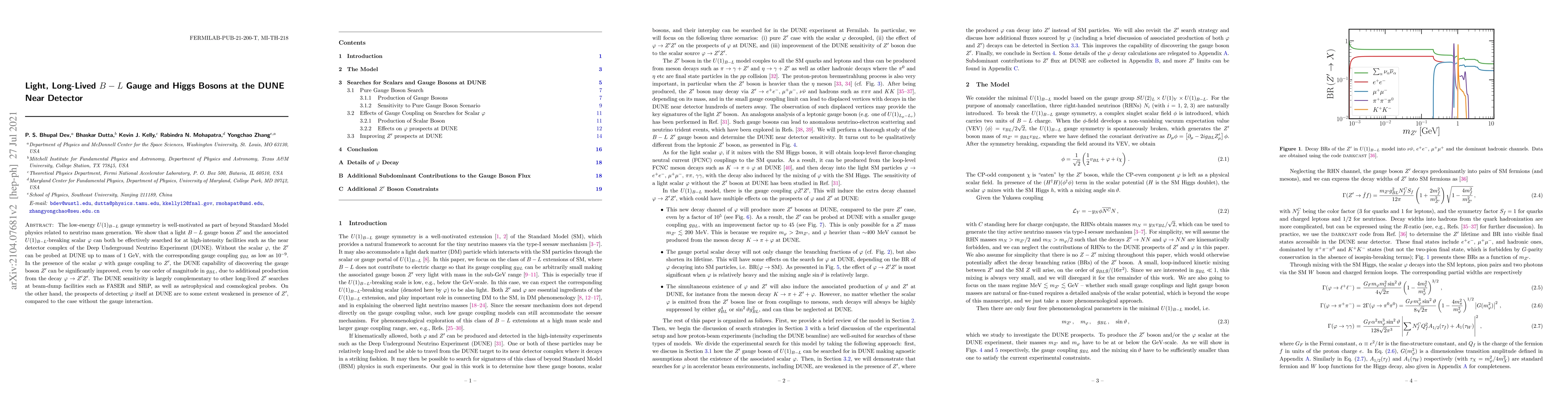 The low-energy $U(1)_{B-L}$ gauge symmetry is well-motivated as part of beyond Standard Model physics related to neutrino mass generation. We show that a light $B-L$ gauge boson $Z{'}$ and the associated $U(1)_{B-L}$-breaking scalar $\varphi$ can both be effectively searched for at high-intensity facilities such as the near detector complex of the Deep Underground Neutrino Experiment (DUNE). Without the scalar $\varphi$, the $Z{'}$ can be probed at DUNE up to mass of 1 GeV, with the corresponding gauge coupling $g_{BL}$ as low as $10^{-9}$. In the presence of the scalar $\varphi$ with gauge coupling to $Z{'}$, the DUNE capability of discovering the gauge boson $Z{'}$ can be significantly improved, even by one order of magnitude in $g_{BL}$, due to additional production from the decay $\varphi \to Z{'}Z{'}$. The DUNE sensitivity is largely complementary to other long-lived $Z{'}$ searches at beam-dump facilities such as FASER and SHiP, as well as astrophysical and cosmological probes. On the other hand, the prospects of detecting $\varphi$ itself at DUNE are to some extent weakened in presence of $Z{'}$, compared to the case without the gauge interaction.