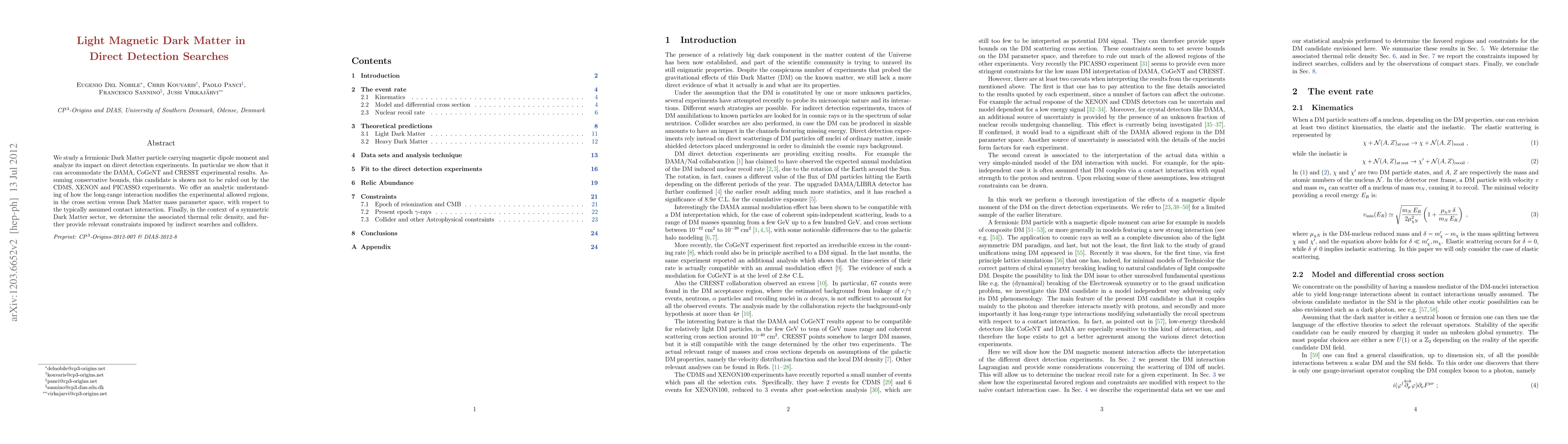 This paper investigates a fermionic Dark Matter particle with a magnetic dipole moment and its implications for direct detection experiments, demonstrating its potential to explain DAMA, CoGeNT, and CRESST results while remaining consistent with CDMS, XENON, and PICASSO constraints. It also provides an analytical understanding of how long-range interactions affect detection limits and discusses the particle's thermal relic density and constraints from indirect searches and colliders.