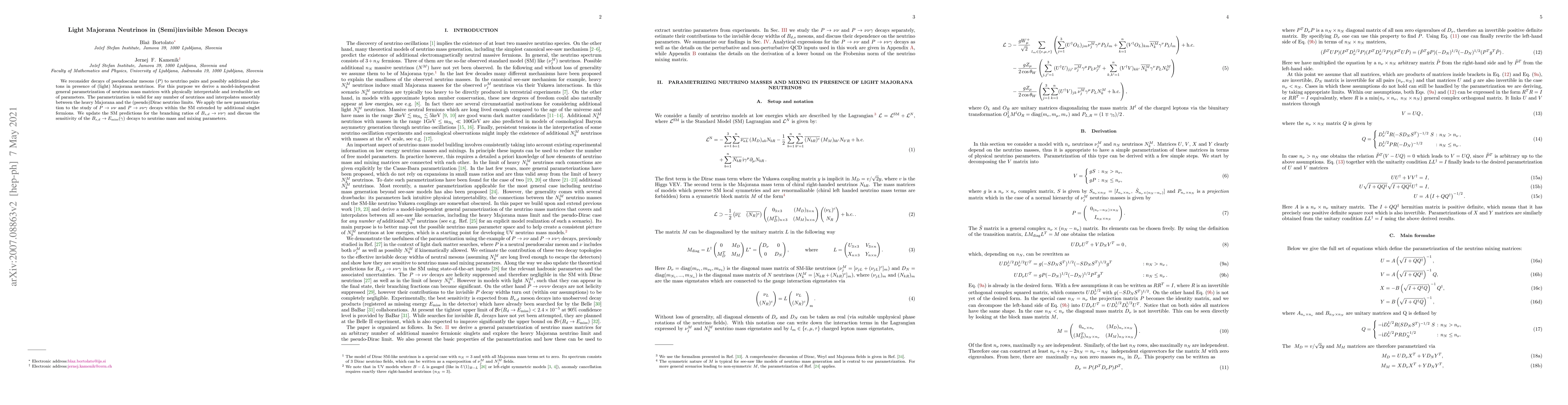 We reconsider decays of pseudoscalar mesons (P) to neutrino pairs and possibly additional photons in presence of (light) Majorana neutrinos. For this purpose we derive a model-independent general parametrization of neutrino mass matrices with physically interpretable and irreducible set of parameters. The parametrization is valid for any number of neutrinos and interpolates smoothly between the heavy Majorana and the (pseudo)Dirac neutrino limits. We apply the new parametrization to the study of $P \rightarrow \nu \nu$ and $P \rightarrow \nu \nu \gamma$ decays within the SM extended by additional singlet fermions. We update the SM predictions for the branching ratios of $B_{s,d} \rightarrow \nu \nu \gamma$ and discuss the sensitivity of the $B_{s,d} \rightarrow E_{\rm miss} (\gamma)$ decays to neutrino mass and mixing parameters.