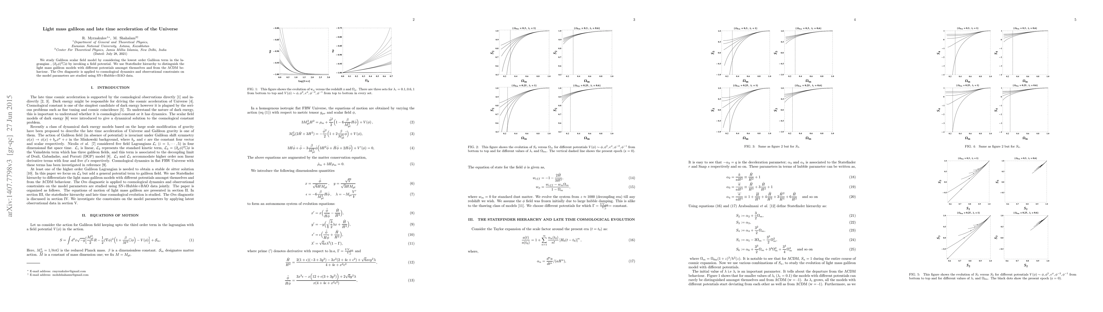This paper investigates the light mass galileon scalar field model using the lowest order Galileon term, $(\partial_{\mu} \phi)^2 \Box\phi$, and compares its late-time acceleration dynamics with $\Lambda$CDM using the Statefinder hierarchy. Observational constraints on the model parameters are derived from SN+Hubble+BAO data.