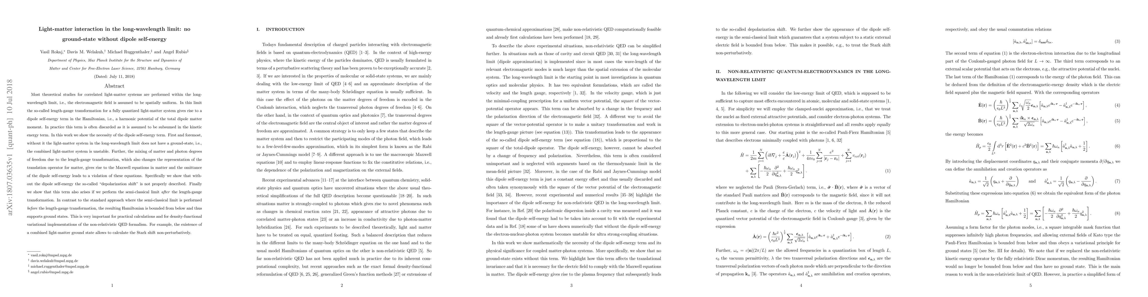 This research emphasizes the critical role of the dipole self-energy term in the long-wavelength limit of light-matter interaction, which is often neglected. The study reveals that without this term, a stable ground state for the light-matter system cannot be achieved, leading to instability and violation of Maxwell equations in matter. The paper also demonstrates that including the dipole self-energy in the semi-classical limit after length-gauge transformation results in a bounded Hamiltonian, supporting ground-states, crucial for practical calculations and density-functional variational implementations of non-relativistic QED.