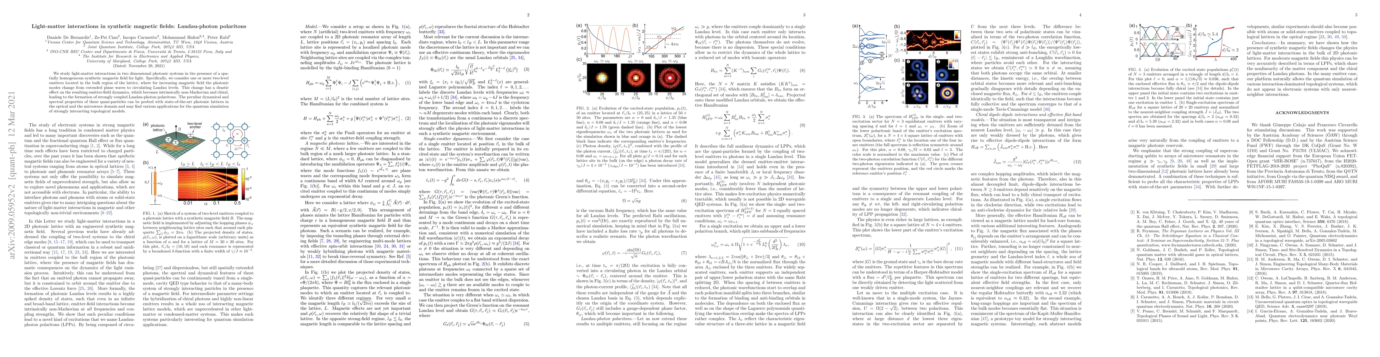 We study light-matter interactions in two dimensional photonic systems in the presence of a spatially homogeneous synthetic magnetic field for light. Specifically, we consider one or more two-level emitters located in the bulk region of the lattice, where for increasing magnetic field the photonic modes change from extended plane waves to circulating Landau levels. This change has a drastic effect on the resulting emitter-field dynamics, which becomes intrinsically non-Markovian and chiral, leading to the formation of strongly coupled Landau-photon polaritons. The peculiar dynamical and spectral properties of these quasi-particles can be probed with state-of-the-art photonic lattices in the optical and the microwave domain and may find various applications for the quantum simulation of strongly interacting topological models.