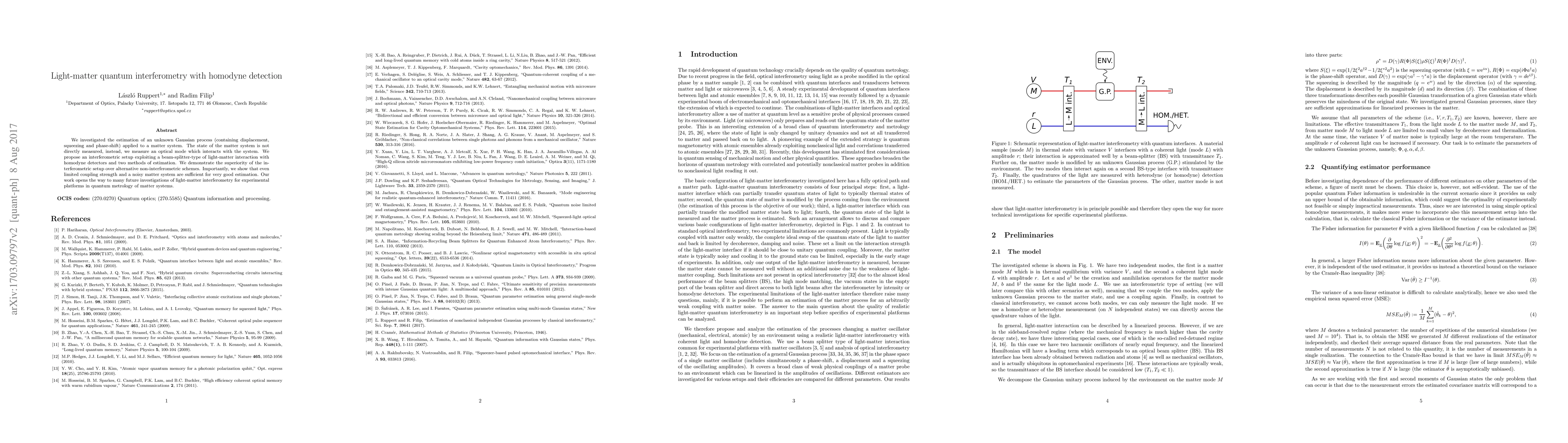 We investigated the estimation of an unknown Gaussian process (containing displacement, squeezing and phase-shift) applied to a matter system. The state of the matter system is not directly measured; instead, we measure an optical mode which interacts with the system. We propose an interferometric setup exploiting a beam-splitter-type of light-matter interaction with homodyne detectors and two methods of estimation. We demonstrate the superiority of the interferometric setup over alternative non-interferometric schemes. Importantly, we show that even limited coupling strength and a noisy matter system are sufficient for very good estimation. Our work opens the way to many future investigations of light-matter interferometry for experimental platforms in quantum metrology of matter systems.