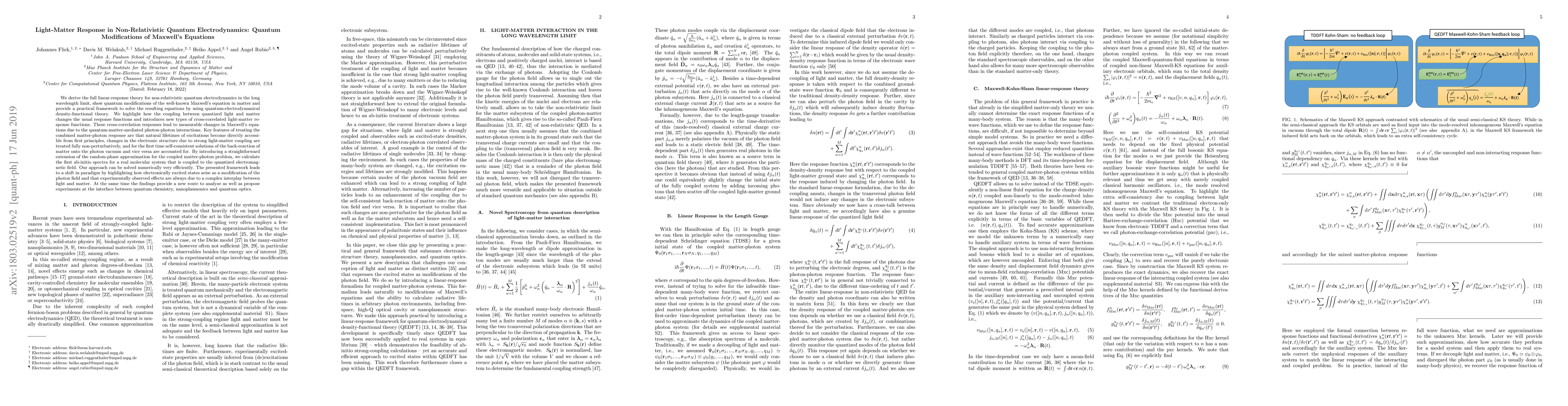 We derive the full linear-response theory for non-relativistic quantum electrodynamics in the long wavelength limit, show quantum modifications of the well-known Maxwell's equation in matter and provide a practical framework to solve the resulting equations by using quantum-electrodynamical density-functional theory. We highlight how the coupling between quantized light and matter changes the usual response functions and introduces new types of cross-correlated light-matter response functions. These cross-correlation responses lead to measurable changes in Maxwell's equations due to the quantum-matter-mediated photon-photon interactions. Key features of treating the combined matter-photon response are that natural lifetimes of excitations become directly accessible from first principles, changes in the electronic structure due to strong light-matter coupling are treated fully non-perturbatively, and for the first time self-consistent solutions of the back-reaction of matter onto the photon vacuum and vice versa are accounted for. By introducing a straightforward extension of the random-phase approximation for the coupled matter-photon problem, we calculate the first ab-initio spectra for a real molecular system that is coupled to the quantized electromagnetic field. Our approach can be solved numerically very efficiently. The presented framework leads to a shift in paradigm by highlighting how electronically excited states arise as a modification of the photon field and that experimentally observed effects are always due to a complex interplay between light and matter. At the same time the findings provide a new route to analyze as well as propose experiments at the interface between quantum chemistry, nanoplasmonics and quantum optics.