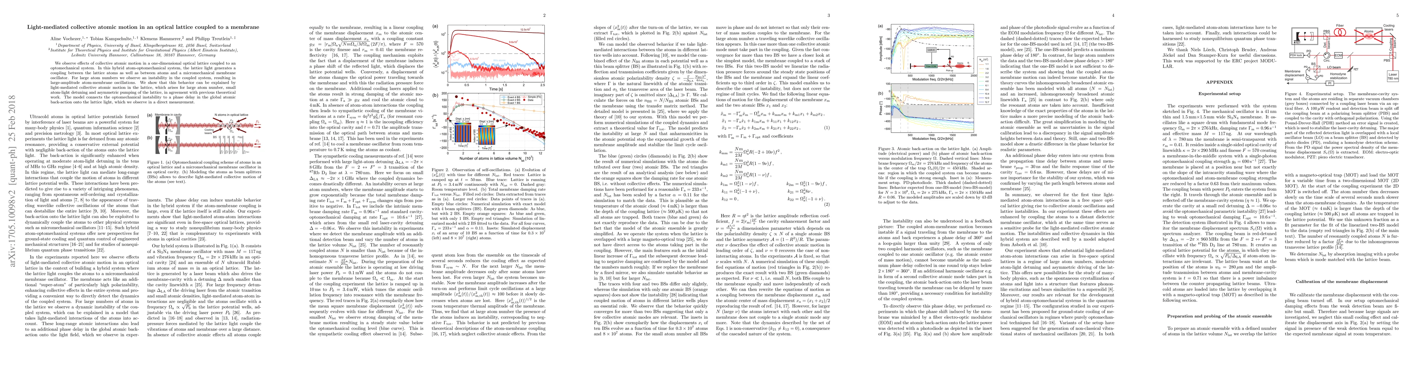 We observe effects of collective atomic motion in a one-dimensional optical lattice coupled to an optomechanical system. In this hybrid atom-optomechanical system, the lattice light generates a coupling between the lattice atoms as well as between atoms and a micromechanical membrane oscillator. For large atom numbers we observe an instability in the coupled system, resulting in large-amplitude atom-membrane oscillations. We show that this behavior can be explained by light-mediated collective atomic motion in the lattice, which arises for large atom number, small atom-light detuning and asymmetric pumping of the lattice, in agreement with previous theoretical work. The model connects the optomechanical instability to a phase delay in the global atomic back-action onto the lattice light, which we observe in a direct measurement.