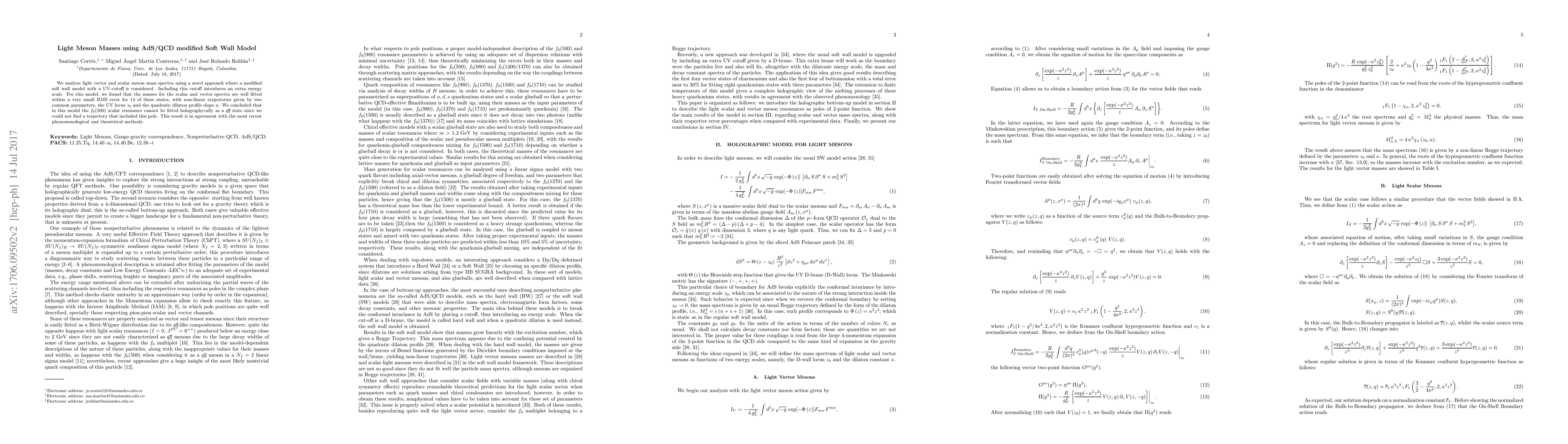 We analyze light vector and scalar meson mass spectra using a novel approach where a modified soft wall model with a UV-cutoff is considered. Including this cutoff introduces an extra energy scale. For this model, we found that the masses for the scalar and vector spectra are well fitted within a very small RMS error for 14 of these states, with non-linear trajectories given by two common parameters, the UV locus $z_0$ and the quadratic dilaton profile slope $\kappa$. We concluded that in this model the $f_{0}(500)$ scalar resonance cannot be fitted holographycally as a $q\overline{q}$ state since we could not find a trajectory that included this pole. This result is in agreement with the most recent phenomenological and theoretical methods.