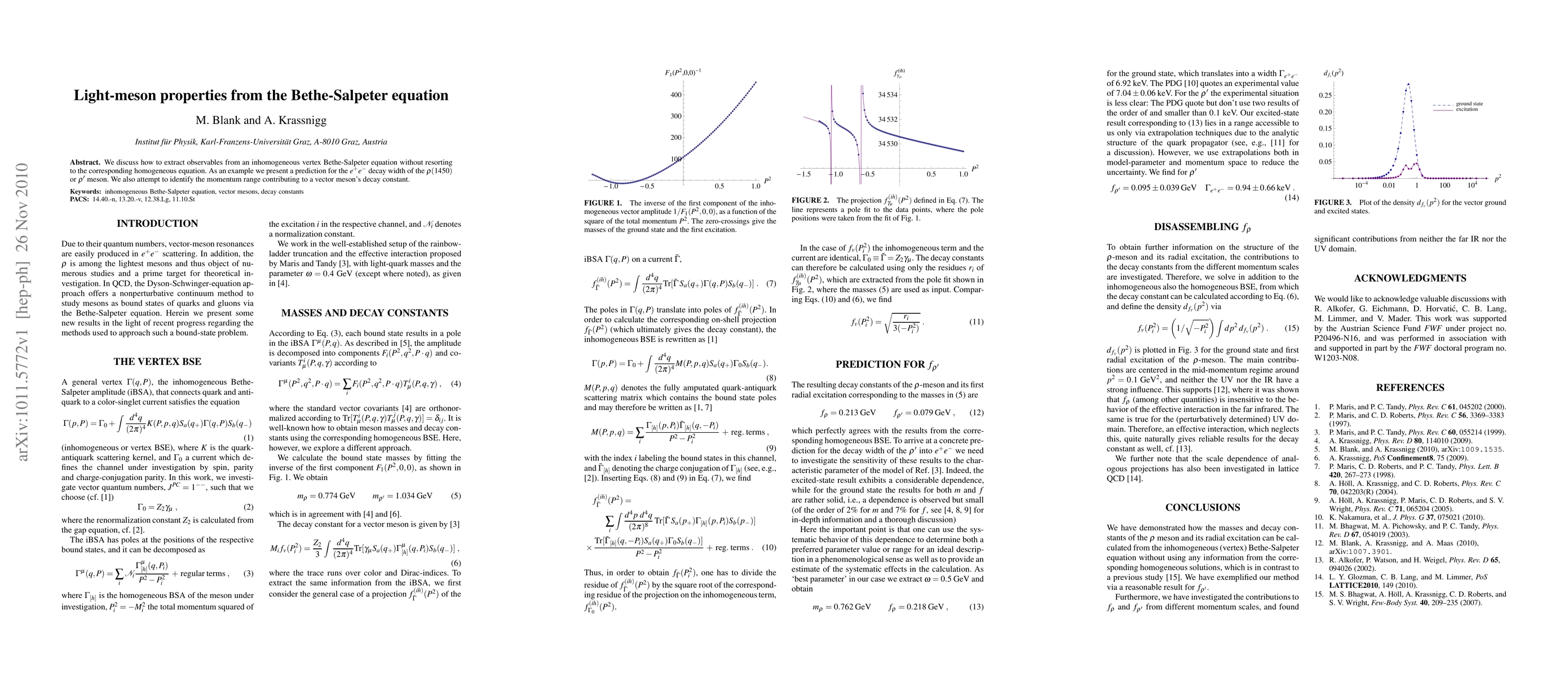 This paper explores extracting light-meson properties from an inhomogeneous Bethe-Salpeter equation, predicting the $e^+e^-$ decay width of the $\rho(1450)$ meson without using the homogeneous equation. It also identifies the momentum range that contributes to the vector meson's decay constant.