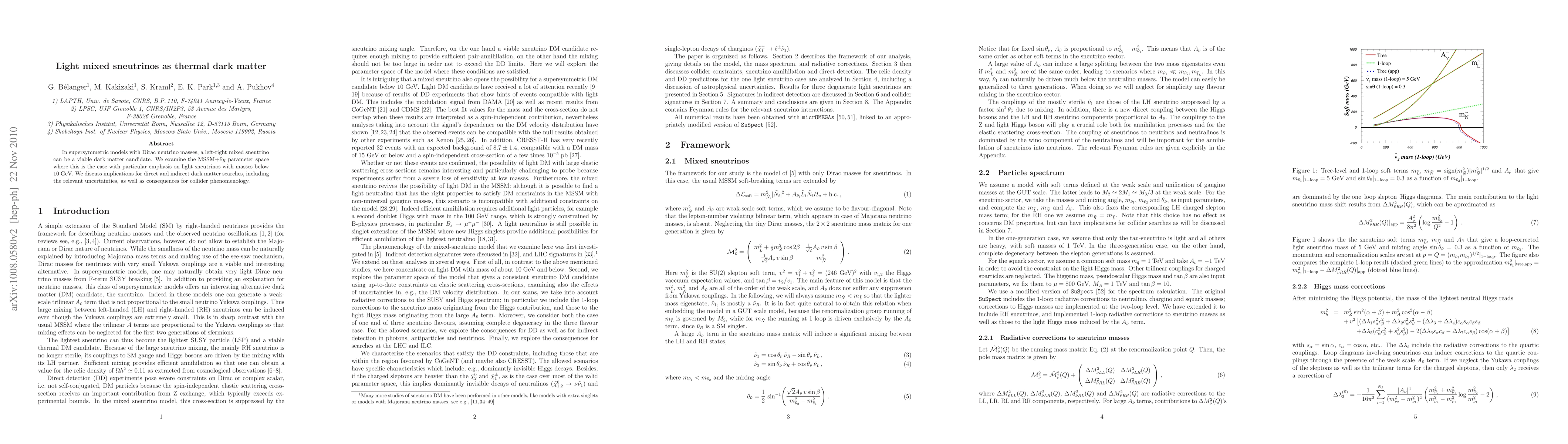 This paper explores the potential of light mixed sneutrinos, with masses below 10 GeV, as viable dark matter candidates in supersymmetric models featuring Dirac neutrino masses. It examines the MSSM+$\tilde\nu_R$ parameter space and discusses implications for dark matter detection and collider phenomenology.
