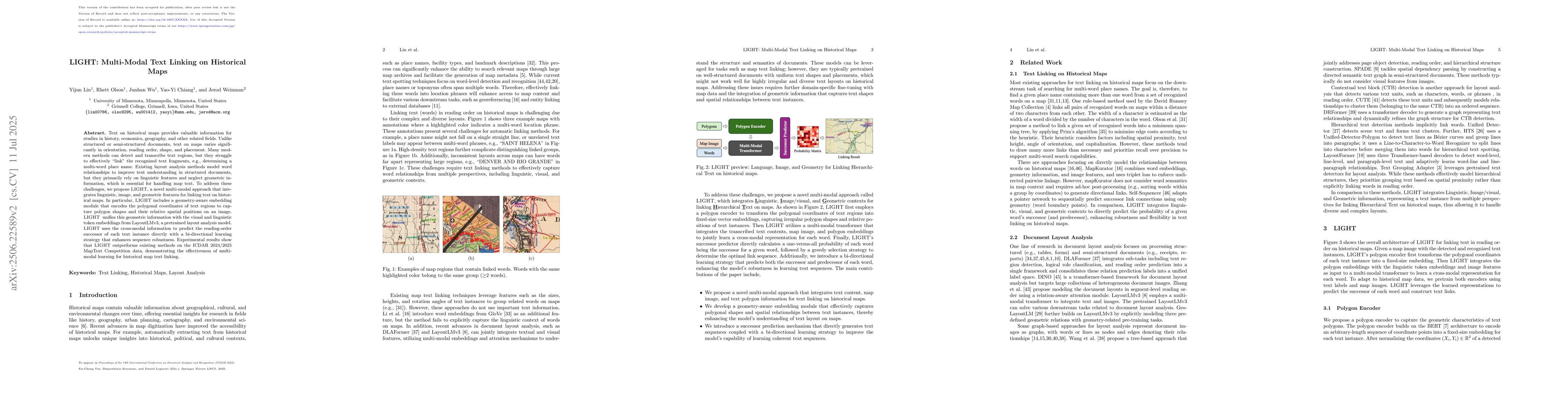 Text on historical maps provides valuable information for studies in history, economics, geography, and other related fields. Unlike structured or semi-structured documents, text on maps varies significantly in orientation, reading order, shape, and placement. Many modern methods can detect and transcribe text regions, but they struggle to effectively ``link'' the recognized text fragments, e.g., determining a multi-word place name. Existing layout analysis methods model word relationships to improve text understanding in structured documents, but they primarily rely on linguistic features and neglect geometric information, which is essential for handling map text. To address these challenges, we propose LIGHT, a novel multi-modal approach that integrates linguistic, image, and geometric features for linking text on historical maps. In particular, LIGHT includes a geometry-aware embedding module that encodes the polygonal coordinates of text regions to capture polygon shapes and their relative spatial positions on an image. LIGHT unifies this geometric information with the visual and linguistic token embeddings from LayoutLMv3, a pretrained layout analysis model. LIGHT uses the cross-modal information to predict the reading-order successor of each text instance directly with a bi-directional learning strategy that enhances sequence robustness. Experimental results show that LIGHT outperforms existing methods on the ICDAR 2024/2025 MapText Competition data, demonstrating the effectiveness of multi-modal learning for historical map text linking.