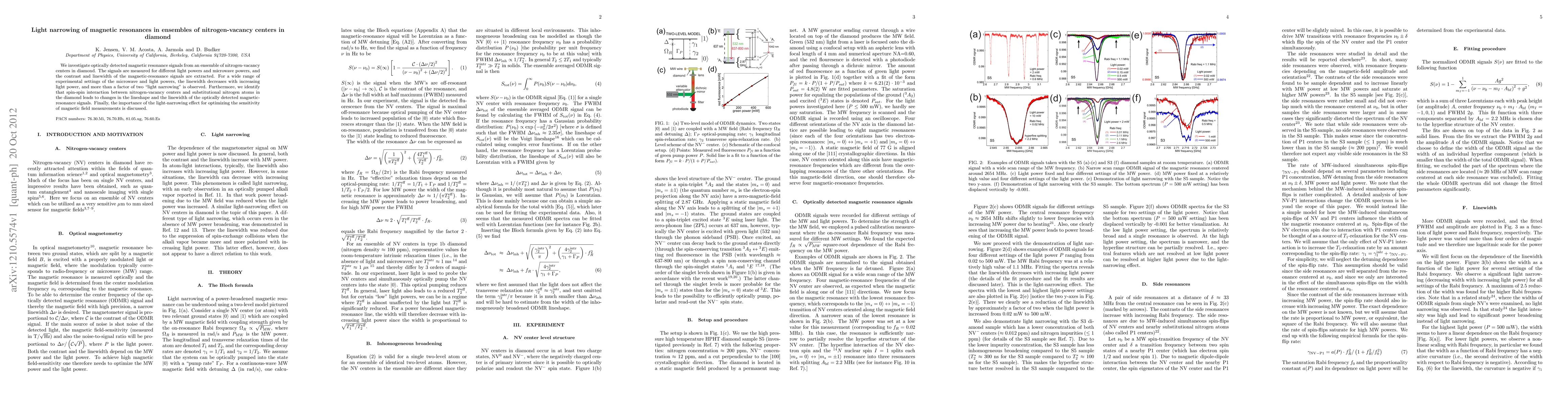 This paper investigates optically detected magnetic resonance in nitrogen-vacancy centers in diamond, observing significant "light narrowing" where linewidth decreases with increased light power. The study also highlights the influence of spin-spin interactions on the resonance signals and discusses the implications for enhancing magnetic field measurement sensitivity.