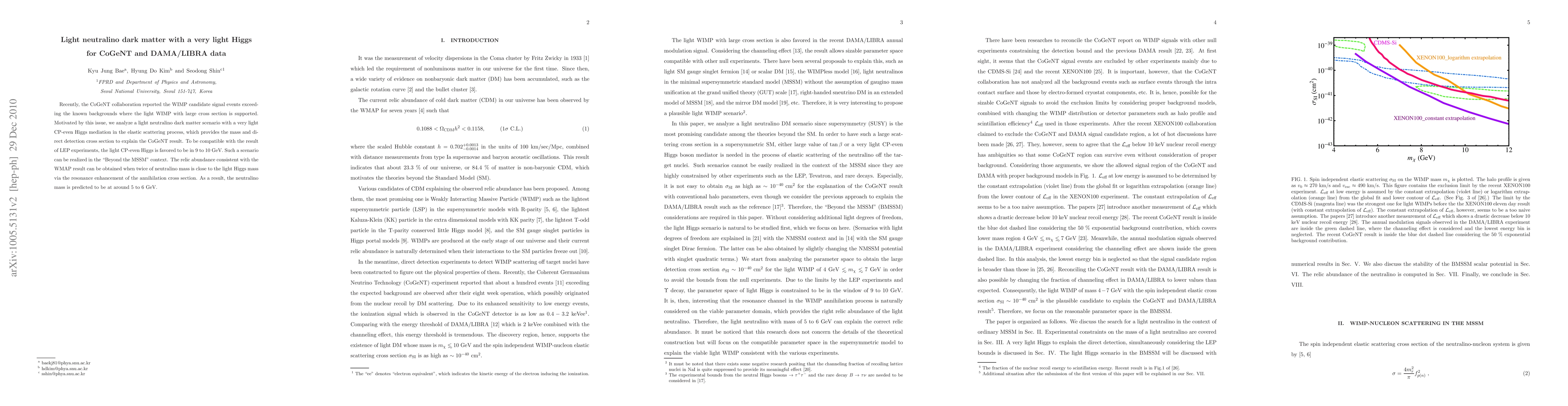 This paper explores a light neutralino dark matter model with a very light Higgs boson to explain the CoGeNT WIMP candidate signal. It proposes a scenario where the neutralino mass is around 5 to 6 GeV, facilitated by a 9 to 10 GeV Higgs, to match the CoGeNT results and the WMAP relic abundance.