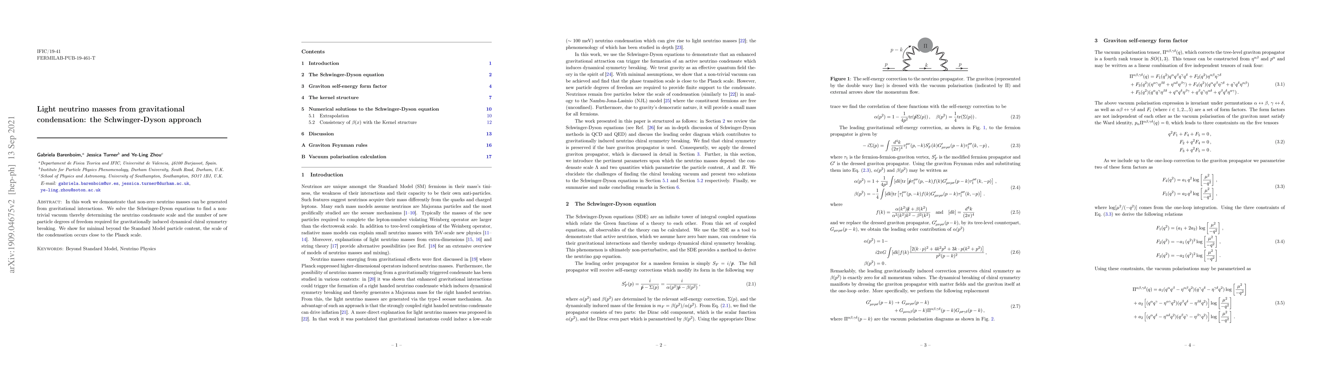 In this work we demonstrate that non-zero neutrino masses can be generated from gravitational interactions. We solve the Schwinger-Dyson equations to find a non-trivial vacuum thereby determining the scale of the neutrino condensate and the number of new particle degrees of freedom required for gravitationally induced dynamical chiral symmetry breaking. We show for minimal beyond the Standard Model particle content, the scale of the condensation occurs close to the Planck scale.