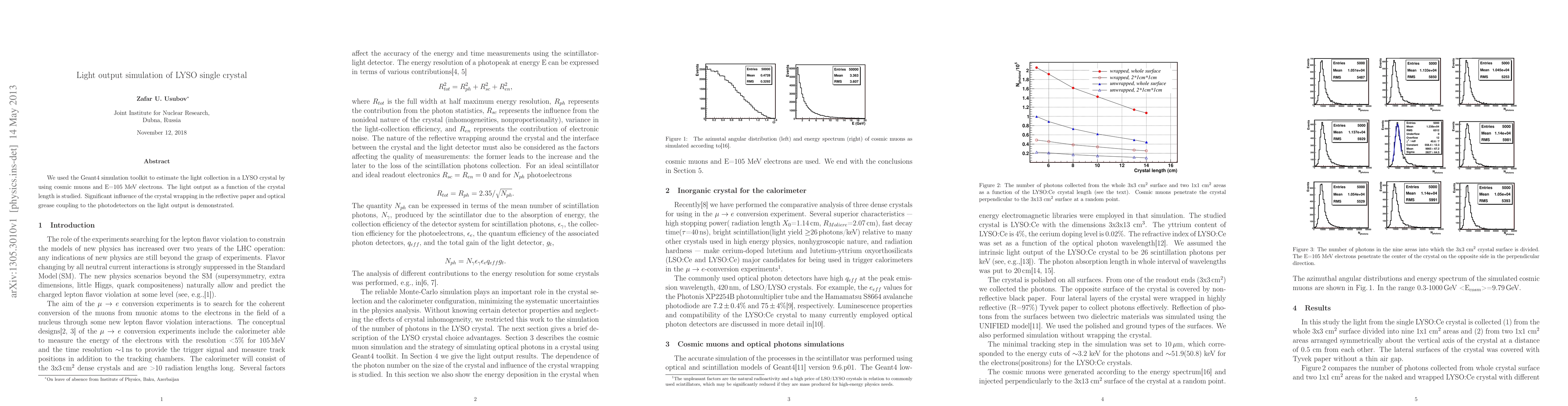 We used the Geant4 simulation toolkit to estimate the light collection in a LYSO crystal by using cosmic muons and E=105 MeV electrons. The light output as a function of the crystal length is studied. Significant influence of the crystal wrapping in the reflective paper and optical grease coupling to the photodetectors on the light output is demonstrated.