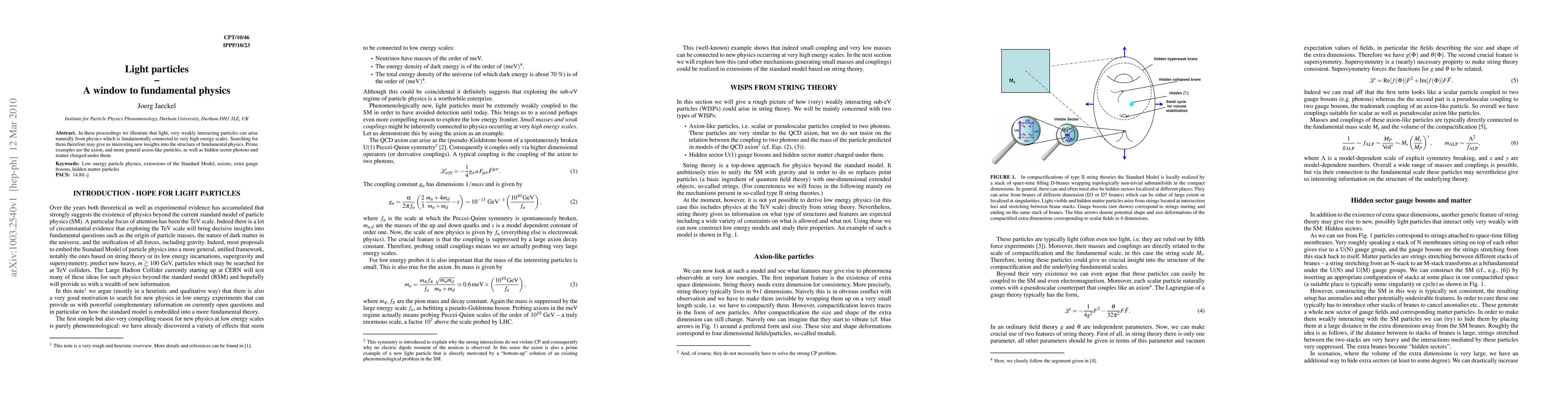 In these proceedings we illustrate that light, very weakly interacting particles can arise naturally from physics which is fundamentally connected to very high energy scales. Searching for them therefore may give us interesting new insights into the structure of fundamental physics. Prime examples are the axion, and more general axion-like particles, as well as hidden sector photons and matter charged under them.
