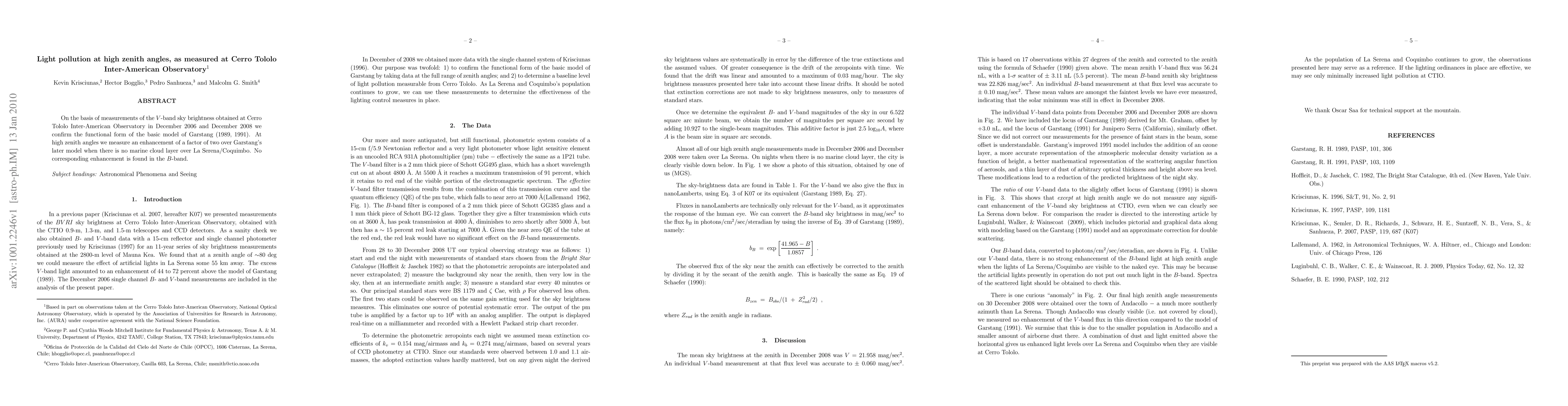 On the basis of measurements of the V-band sky brightness obtained at Cerro Tololo Inter-American Observatory in December 2006 and December 2008 we confirm the functional form of the basic model of Garstang (1989, 1991). At high zenith angles we measure an enhancement of a factor of two over Garstang's later model when there is no marine cloud layer over La Serena/Coquimbo. No corresponding enhancement is found in the B-band.
