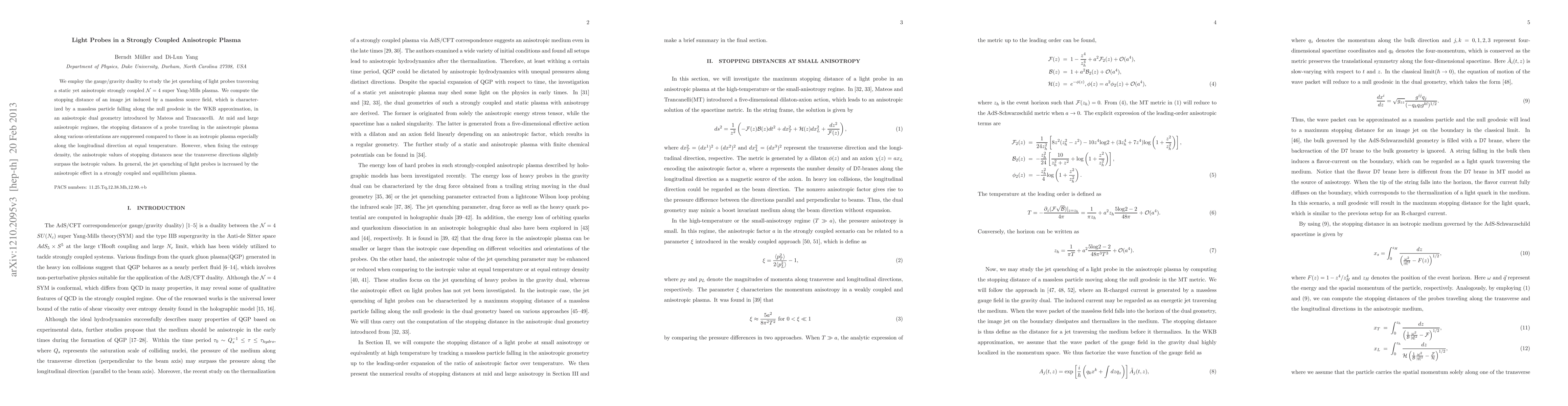 This paper uses gauge/gravity duality to investigate how light probes experience jet quenching in a strongly coupled anisotropic plasma. The study shows that the stopping distance of light probes is generally reduced in anisotropic plasmas, especially along the longitudinal direction, though near the transverse directions, anisotropic values can slightly exceed isotropic ones when entropy density is fixed.