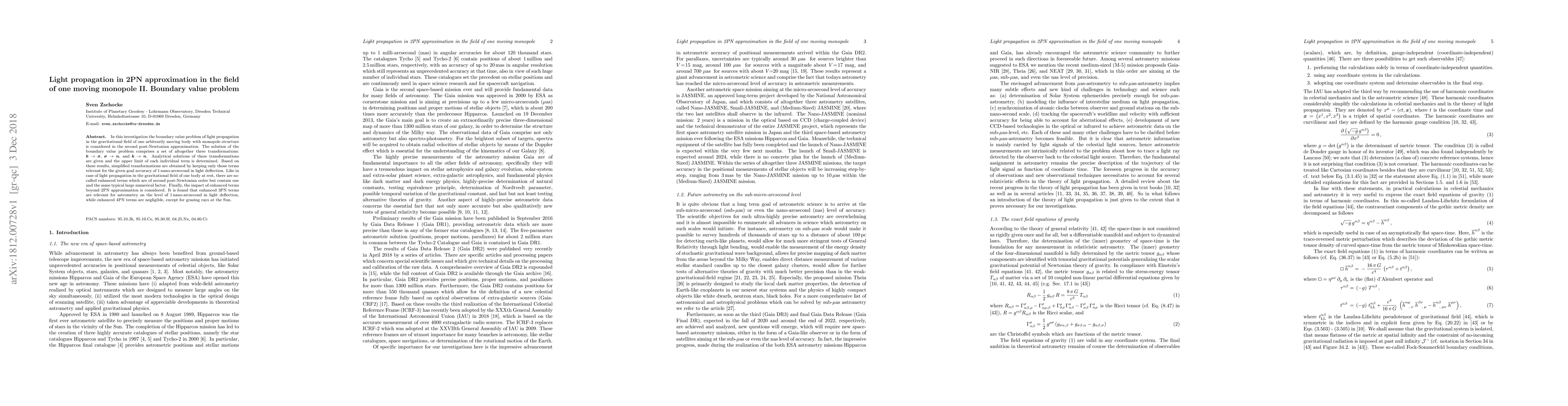 This paper investigates the boundary value problem of light propagation in the gravitational field of a moving monopole, solving three transformations in the second post-Newtonian approximation. Enhanced terms beyond 2PN, particularly 3PN, are found to be significant for astrometry at the 1 nano-arcsecond level.