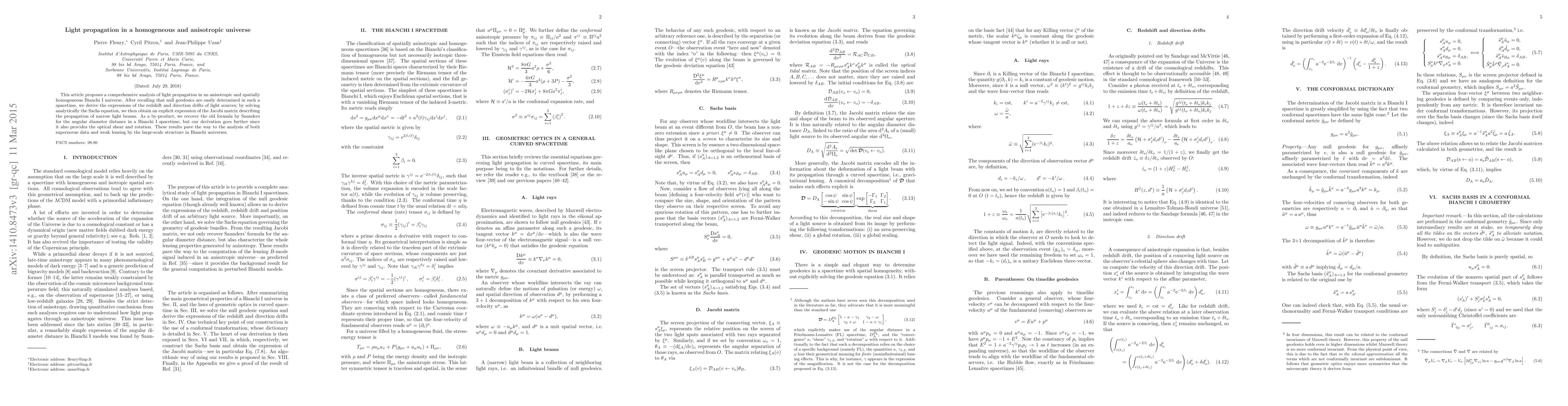 This paper analyzes light propagation in a homogeneous and anisotropic Bianchi I universe, deriving expressions for redshift, direction drifts, and the Jacobi matrix for narrow light beams, and providing new insights into optical shear and rotation, which are crucial for interpreting supernovae data and weak lensing effects.