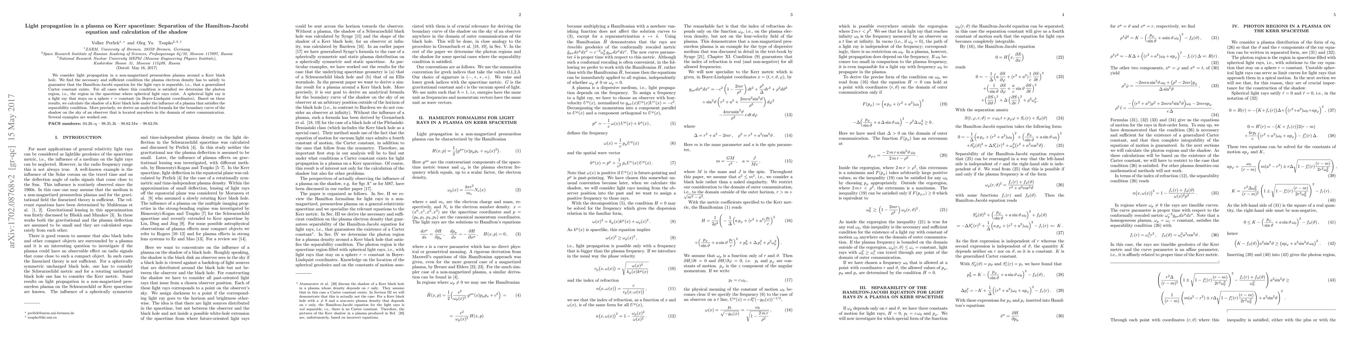 This paper explores light propagation in a plasma around a Kerr black hole, determining the necessary condition for separability of the Hamilton-Jacobi equation and calculating the shadow cast by the black hole, given the plasma's electron density satisfies this condition. Analytical formulas for the shadow's boundary curve are derived for observers in the domain of outer communication.