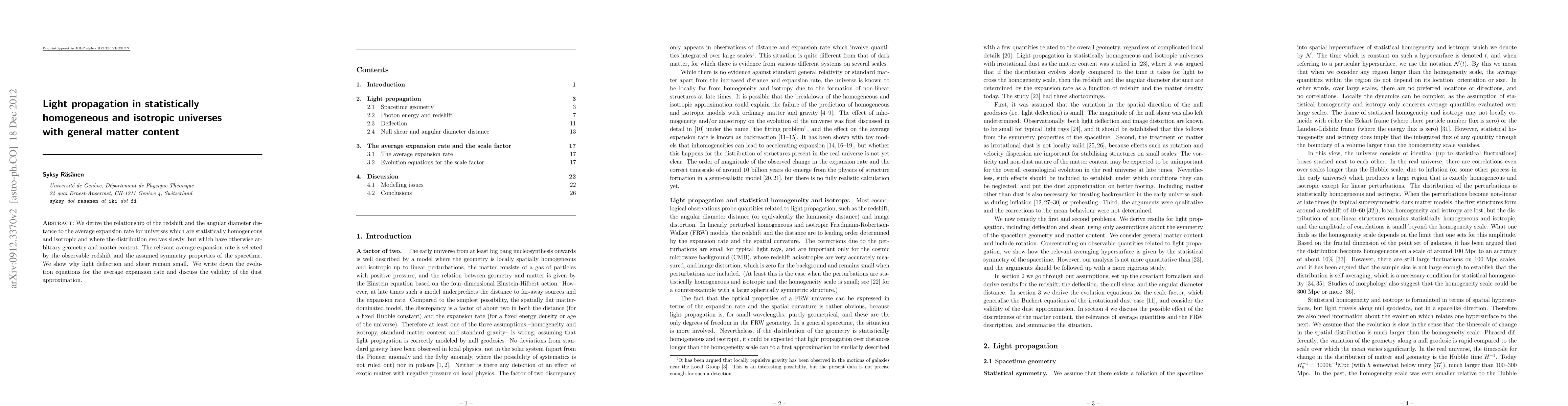 This paper derives the relationship between redshift and angular diameter distance in statistically homogeneous and isotropic universes with arbitrary geometry and matter content, showing that light deflection and shear remain small. It also discusses the evolution of the average expansion rate and the validity of the dust approximation.
