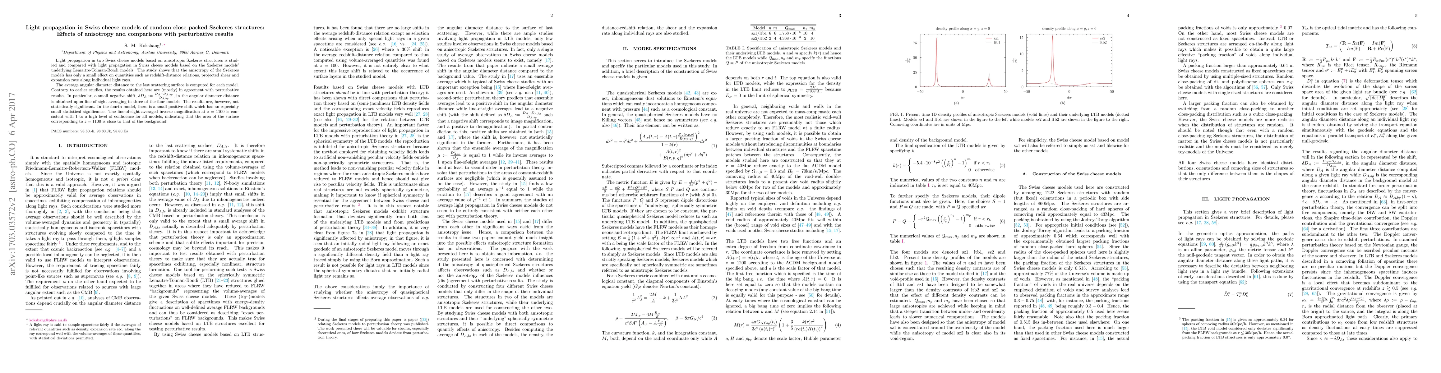 Light propagation in two Swiss cheese models based on anisotropic Szekeres structures is studied and compared with light propagation in Swiss cheese models based on the Szekeres models' underlying LTB models. The study shows that the anisotropy of the Szekeres models has only a small effect on quantities such as redshift-distance relations, projected shear and expansion rate along individual light rays. \newline\indent The average angular diameter distance to the last scattering surface is computed for each model. Contrary to earlier studies, the results obtained here are (mostly) in agreement with perturbative results. In particular, a small negative shift, $\delta D_A:=\frac{D_A-D_{A,bg}}{D_{A,bg}}$, in the angular diameter distance is obtained upon line-of-sight averaging in three of the four models. The results are, however, not statistically significant. In the fourth model, there is a small positive shift which has an especially small statistical significance. The line-of-sight averaged inverse magnification at $z = 1100$ is consistent with $1$ to a high level of confidence for all models, indicating that the area of the surface corresponding to $z = 1100$ is close to that of the background.