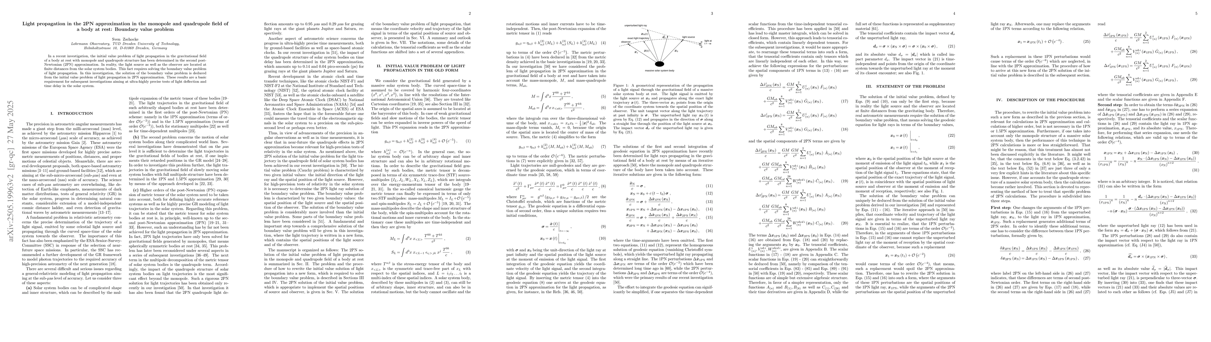 Researchers solved a boundary value problem to determine light propagation in the gravitational field of celestial bodies using the 2PN approximation, laying the groundwork for precise tests of light deflection and time delay.