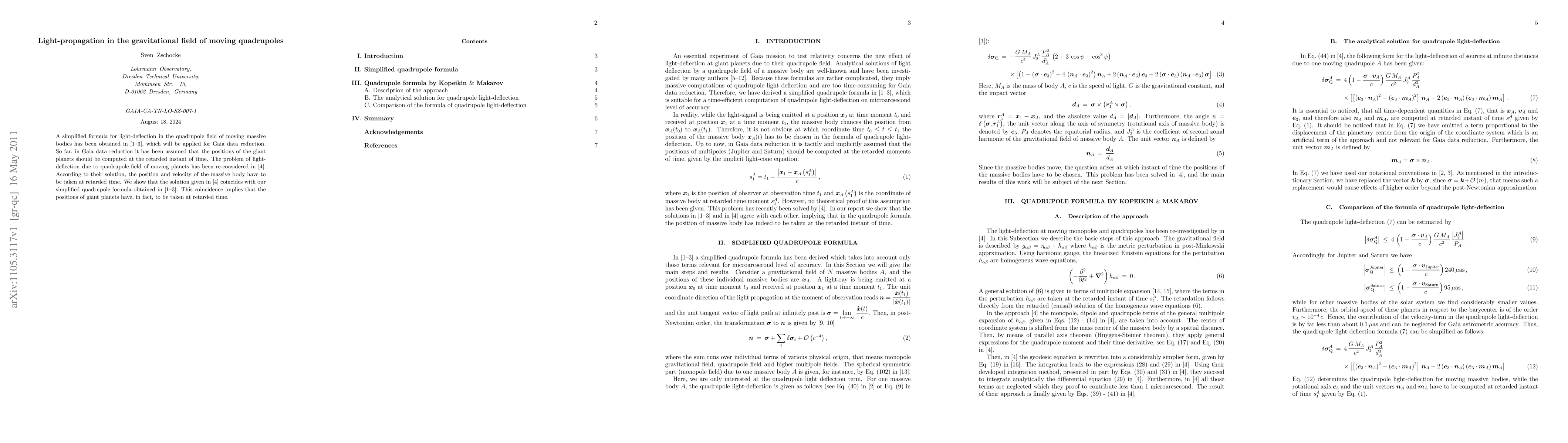 A simplified formula for light-deflection in the quadrupole field of moving massive bodies has been obtained in [1,2,3], which will be applied for Gaia data reduction. So far, in Gaia data reduction it has been assumed that the positions of the giant planets should be computed at the retarded instant of time. The problem of light-deflection due to quadrupole field of moving planets has been re-considered in [4]. According to their solution, the position and velocity of the massive body have to be taken at retarded time. We show that the solution given in [4] coincides with our simplified quadrupole formula obtained in [1,2,3]. This coincidence implies that the positions of giant planets have, in fact, to be taken at retarded time.