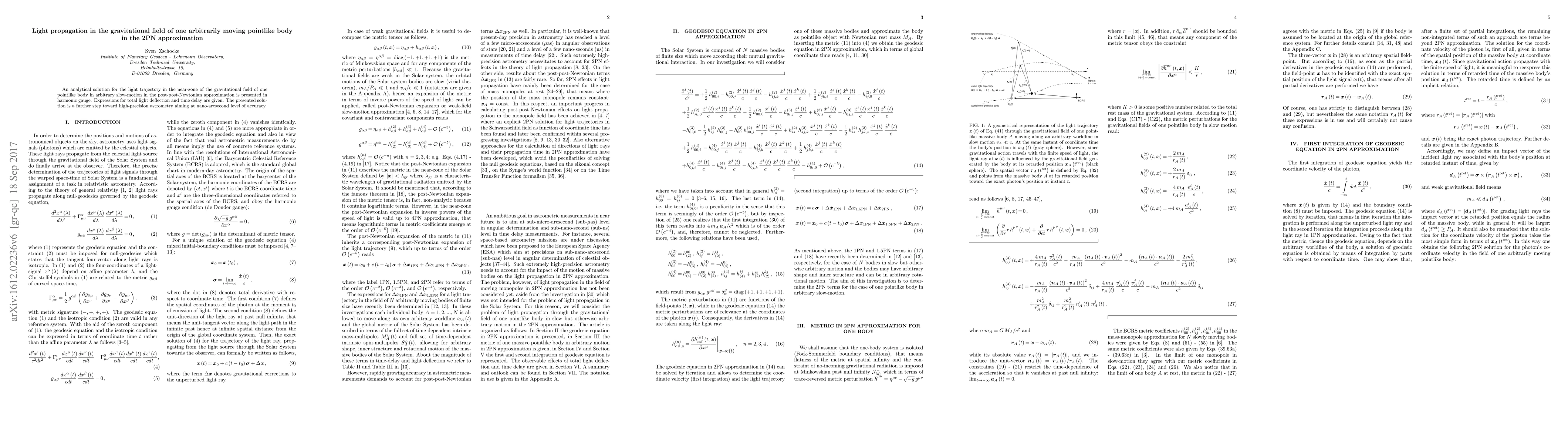This paper presents an analytical solution for light propagation in the gravitational field of a slowly moving pointlike body, using the post-post-Newtonian approximation. The solution provides expressions for light deflection and time delay, contributing to high-precision astrometry.