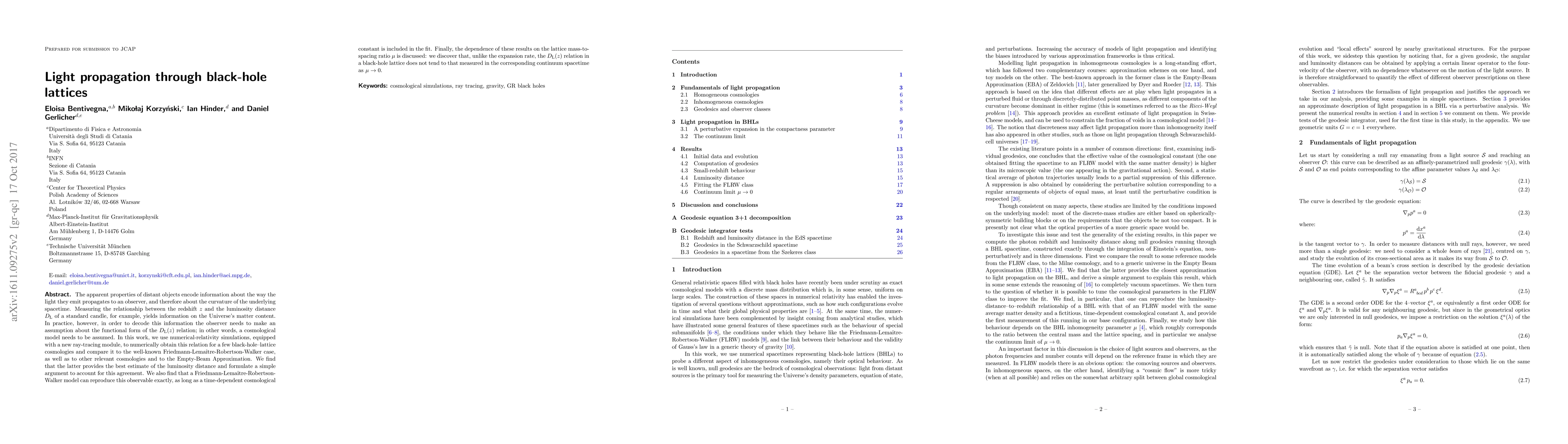 This research uses numerical-relativity simulations with a ray-tracing module to explore light propagation in black-hole lattice cosmologies. Comparisons reveal that the Empty-Beam Approximation best estimates luminosity distance, and a Friedmann-Lemaître-Robertson-Walker model with a time-dependent cosmological constant accurately reproduces observations. Interestingly, the $D_{\rm L}(z)$ relation in a black-hole lattice doesn't converge to the continuum spacetime relation as lattice mass-to-spacing ratio $mu$ approaches zero.