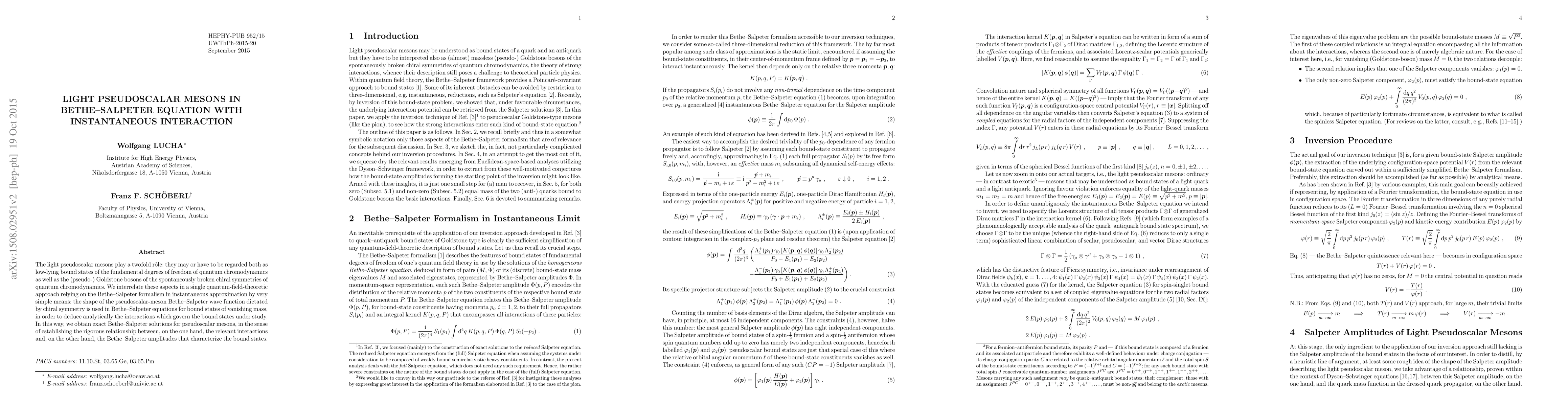 This paper uses the Bethe-Salpeter equation with instantaneous interaction to study light pseudoscalar mesons, linking their role as both QCD bound states and pseudo-Goldstone bosons through chiral symmetry. It derives exact solutions for these mesons by utilizing their Bethe-Salpeter wave function shapes dictated by chiral symmetry.