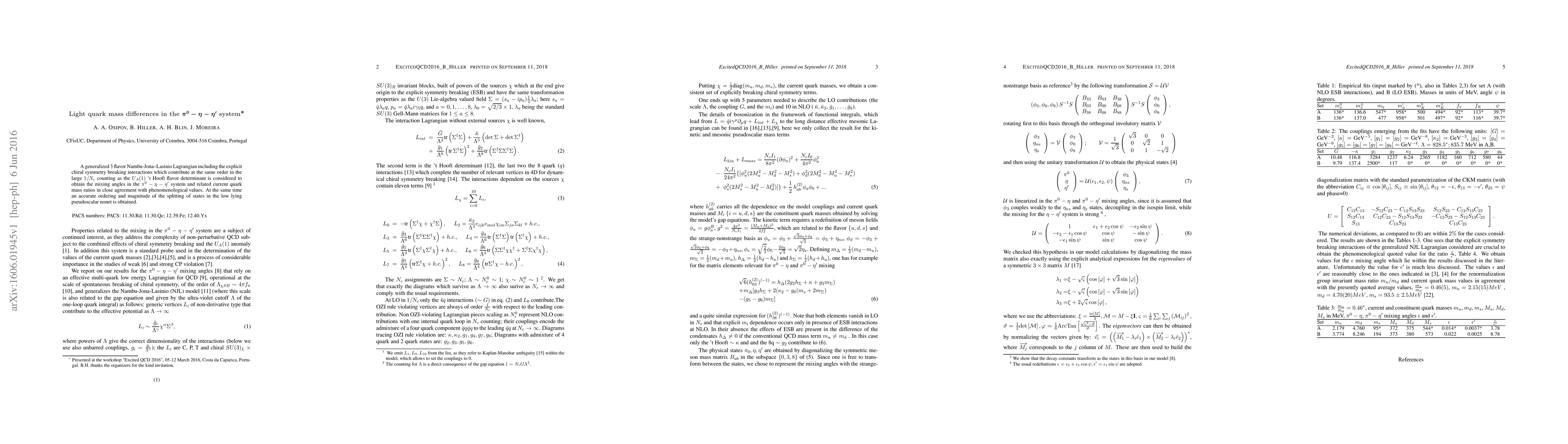 A generalized 3 flavor Nambu-Jona--Lasinio Lagrangian including the explicit chiral symmetry breaking interactions which contribute at the same order in the large $1/N_c$ counting as the $U_A(1)$ 't Hooft flavor determinant is considered to obtain the mixing angles in the $\pi^0-\eta-\eta'$ system and related current quark mass ratios in close agreement with phenomenological values. At the same time an accurate ordering and magnitude of the splitting of states in the low lying pseudoscalar nonet is obtained.
