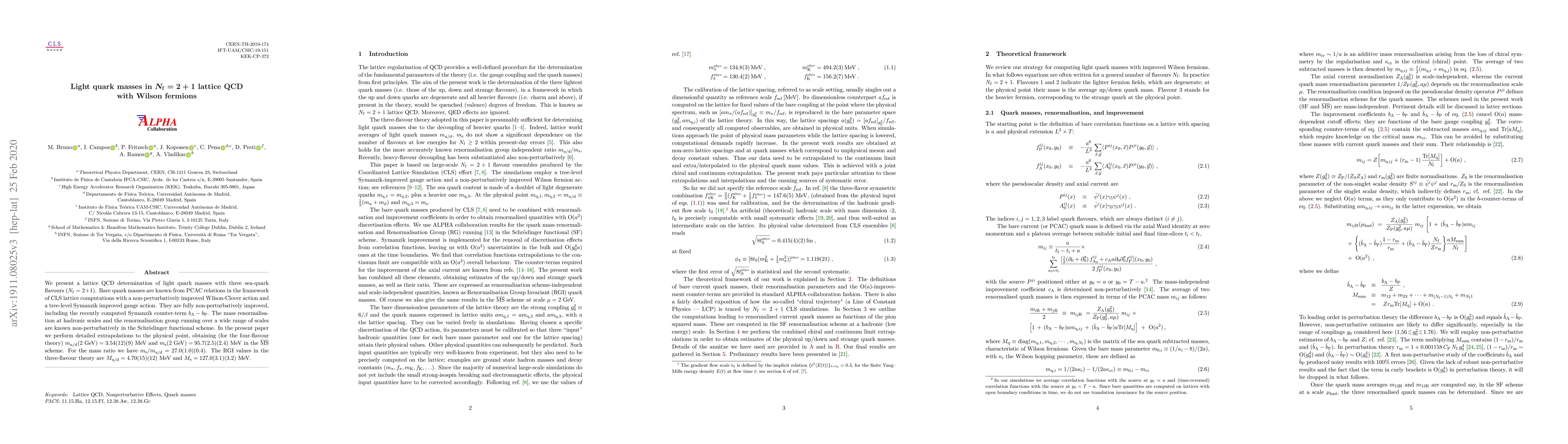 This paper reports lattice QCD calculations of light quark masses using $N_f = 2+1$ flavors with Wilson fermions, achieving precise non-perturbative improvements. The results yield $m_{u/d}(2{\rm GeV}) = 3.54(12)(9)$ MeV and $m_s(2{\rm GeV}) = 95.7(2.5)(2.4)$ MeV in the $\bar{MS}$ scheme, with a mass ratio $m_s/m_{u/d} = 27.0(1.0)(0.4)$.